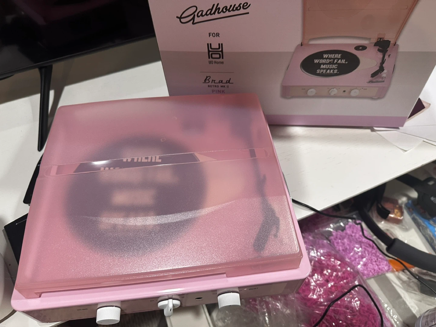 This Gadhous Retro MK II record player is a stylish pink colour. It plays vinyl records and has a transparent lid. The phrase 'Where words fail, music speaks' is displayed on the turntable. It's a fun way to enjoy your music collection!