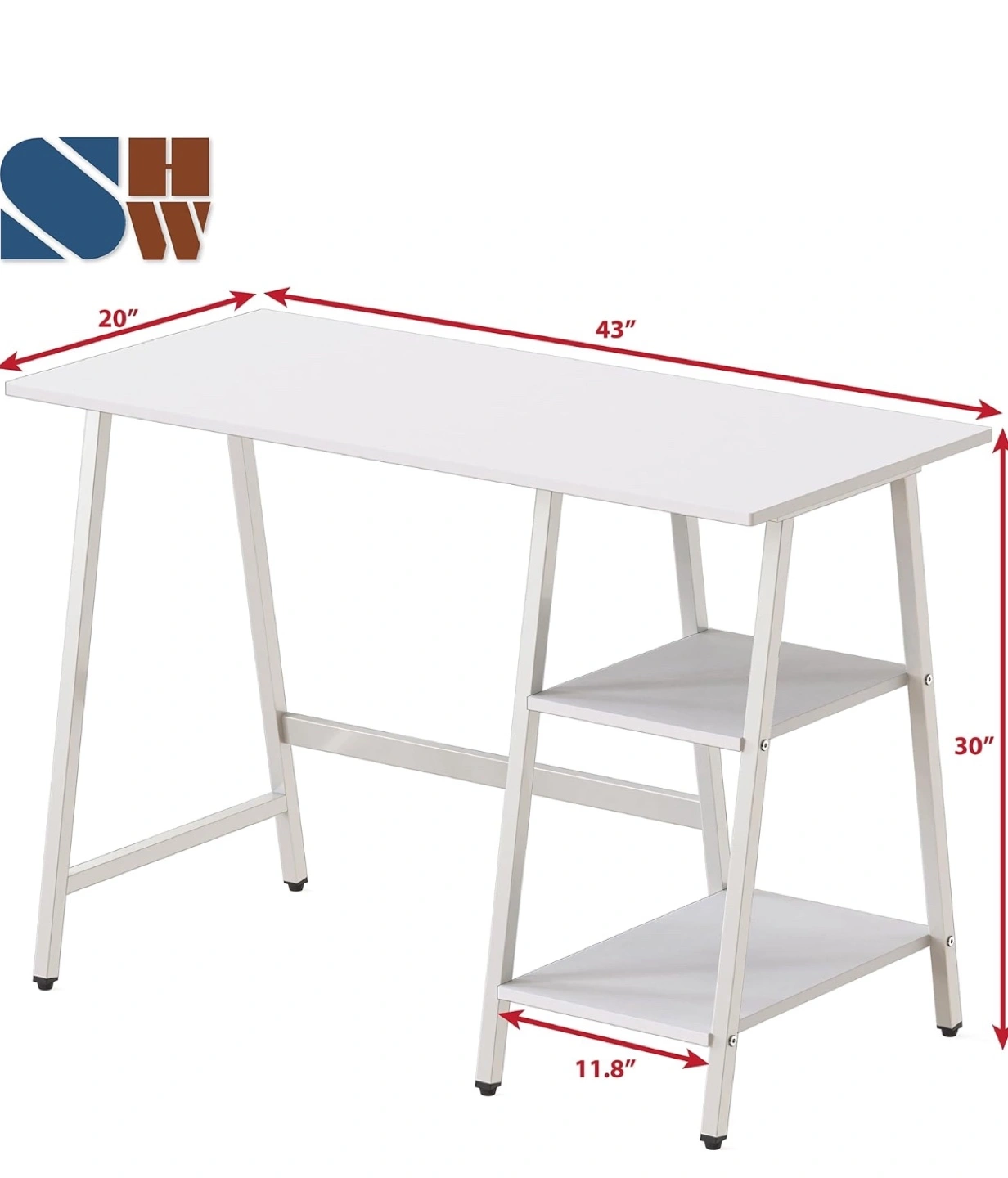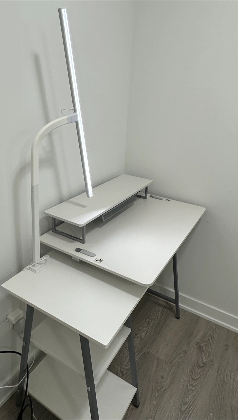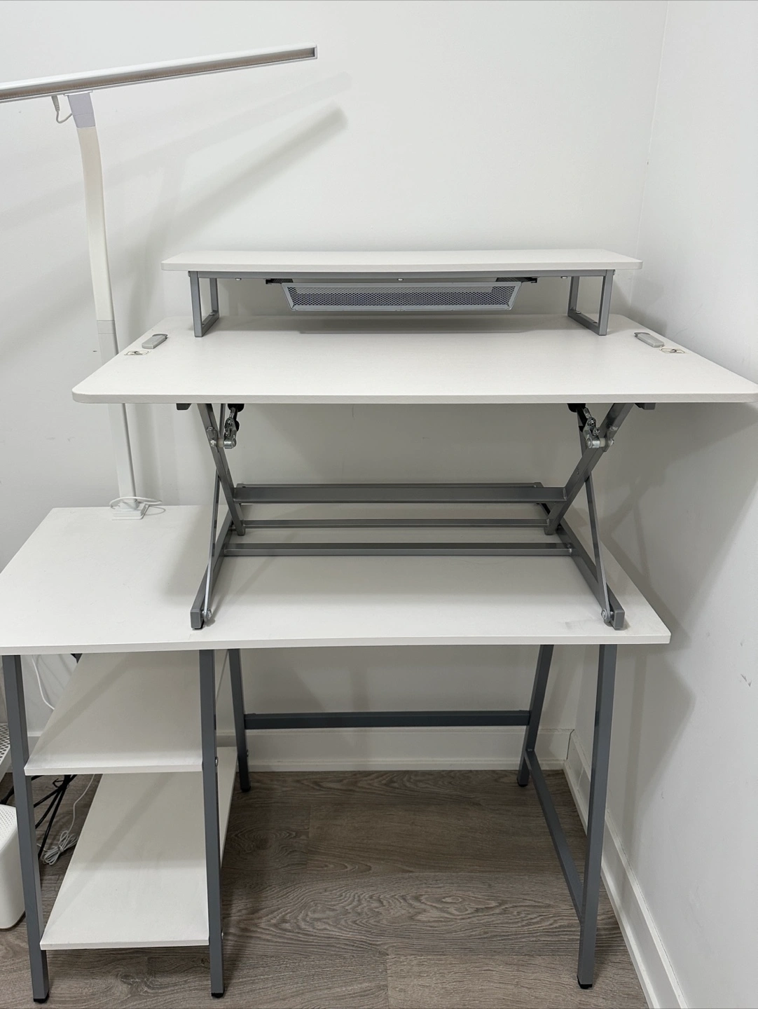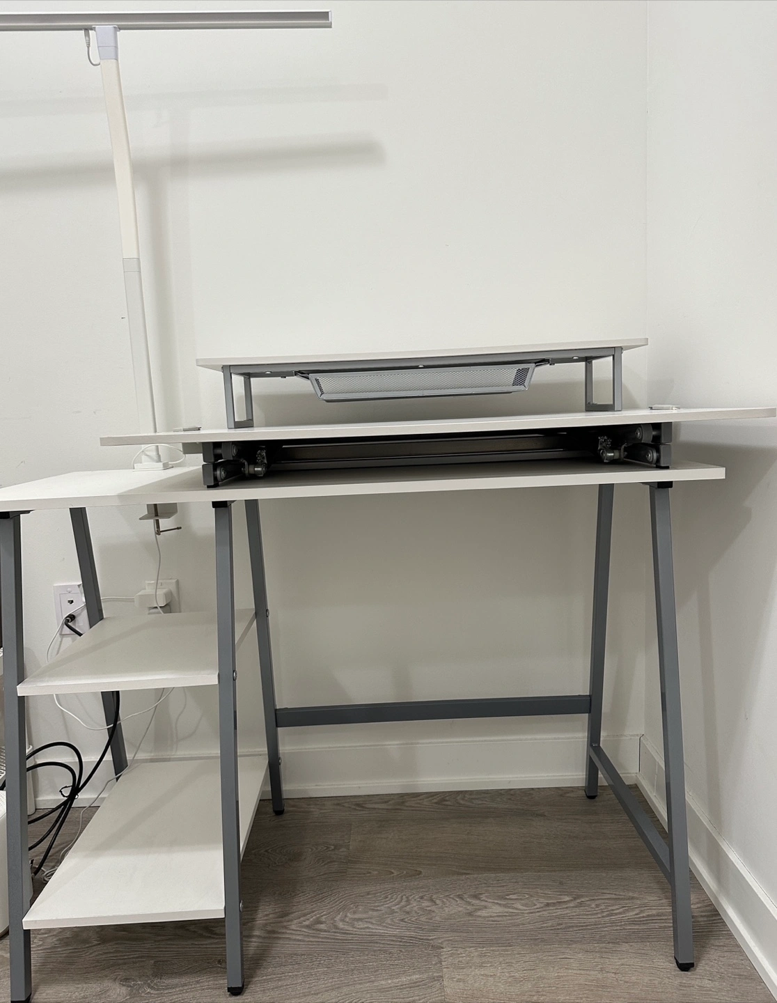 White standing desk with grey metal frame. Features a height-adjustable top section and a smaller lower shelf. Includes a built-in tray. A separate white desk with two shelves is also included. A desk lamp is also included.