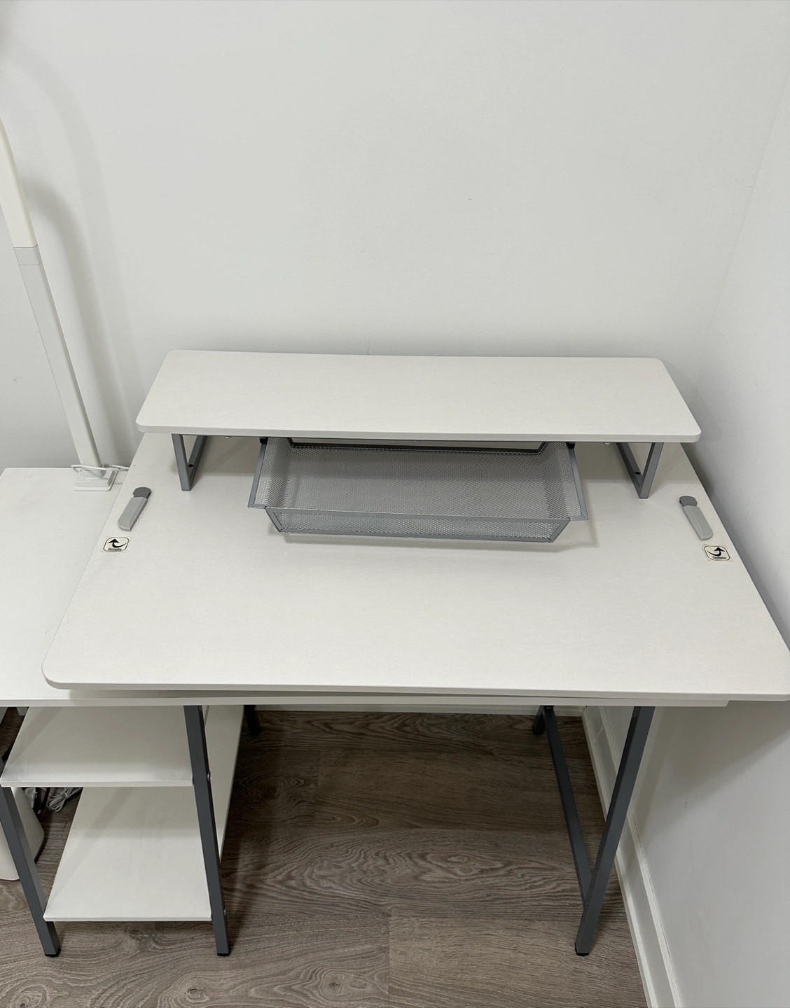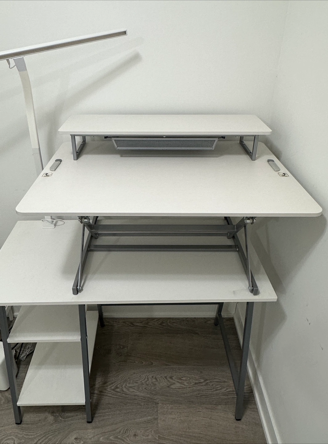 White standing desk with grey metal frame. Features a height-adjustable top section and a smaller lower shelf. Includes a built-in tray. A separate white desk with two shelves is also included. A desk lamp is also included.