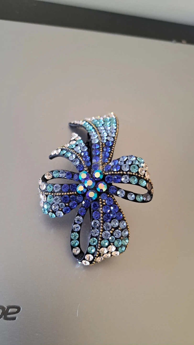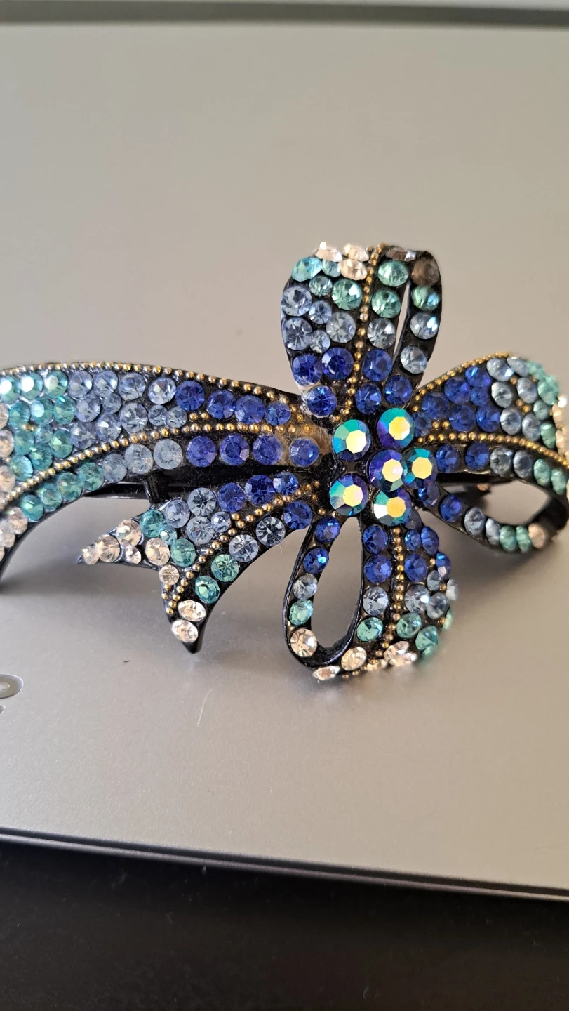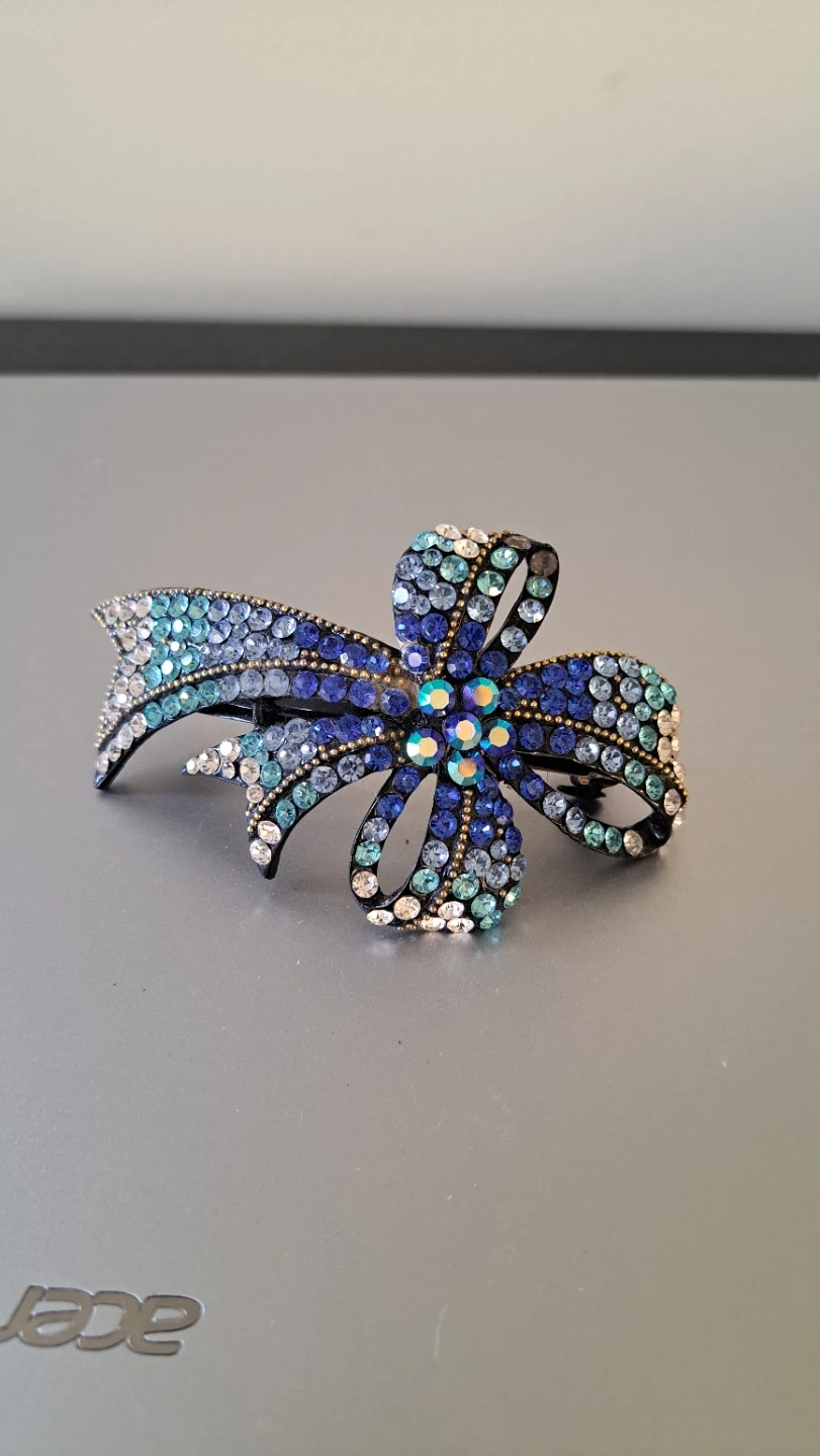 This sparkly barrette features a blue bow design encrusted with various shades of blue and clear rhinestones. The metal clip mechanism is sturdy and secure. It's a pretty accessory for your hair!
