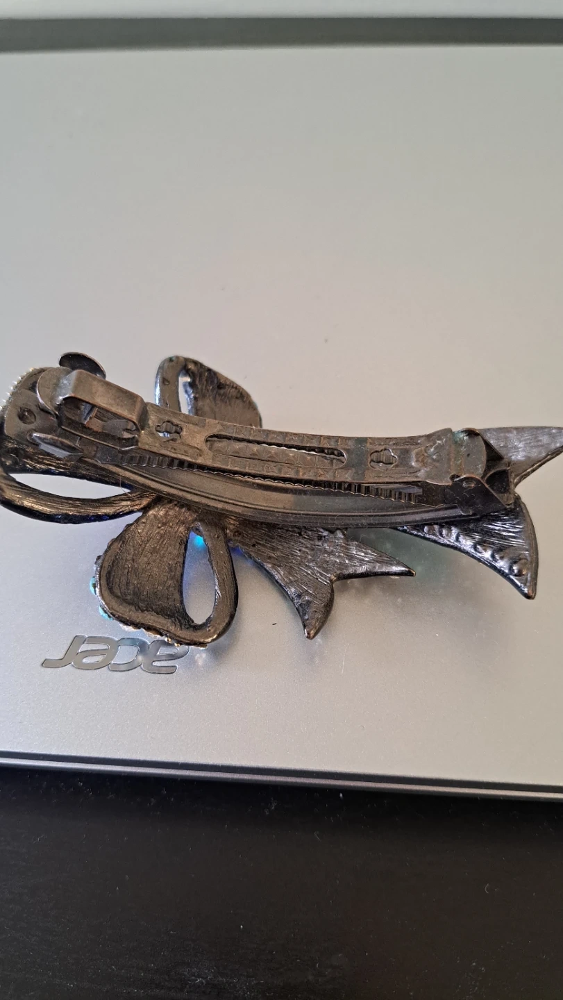 This sparkly barrette features a blue bow design encrusted with various shades of blue and clear rhinestones. The metal clip mechanism is sturdy and secure. It's a pretty accessory for your hair!