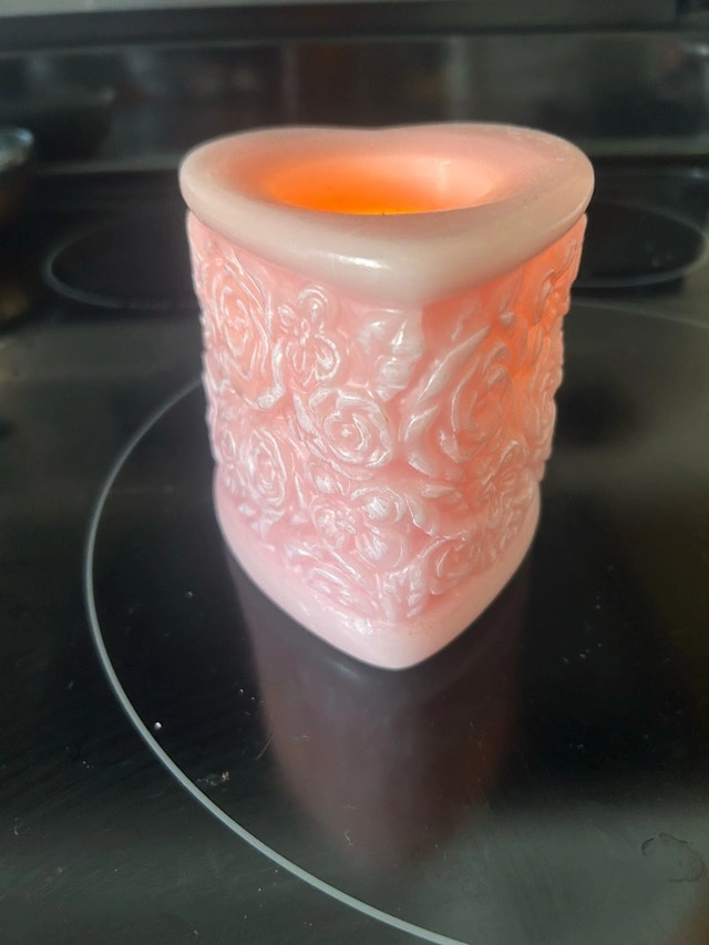 The candle runs on two "C" batteries (not included). Has flickering motion, looks like it is lit. Cannot be lit with match, no flame, so safe if left on. Candle does not burn, so it lasts for years. Pretty design. Pickup in Kanata close to Moodie Dr and Queensway. No delivery.