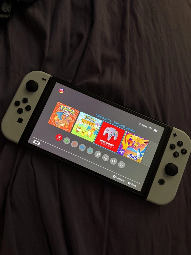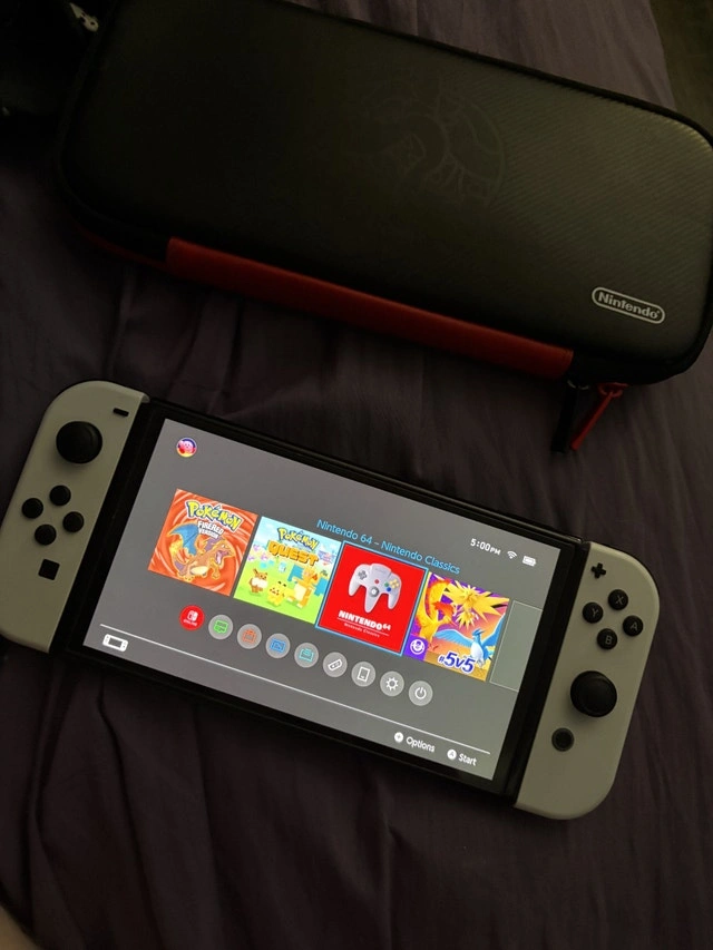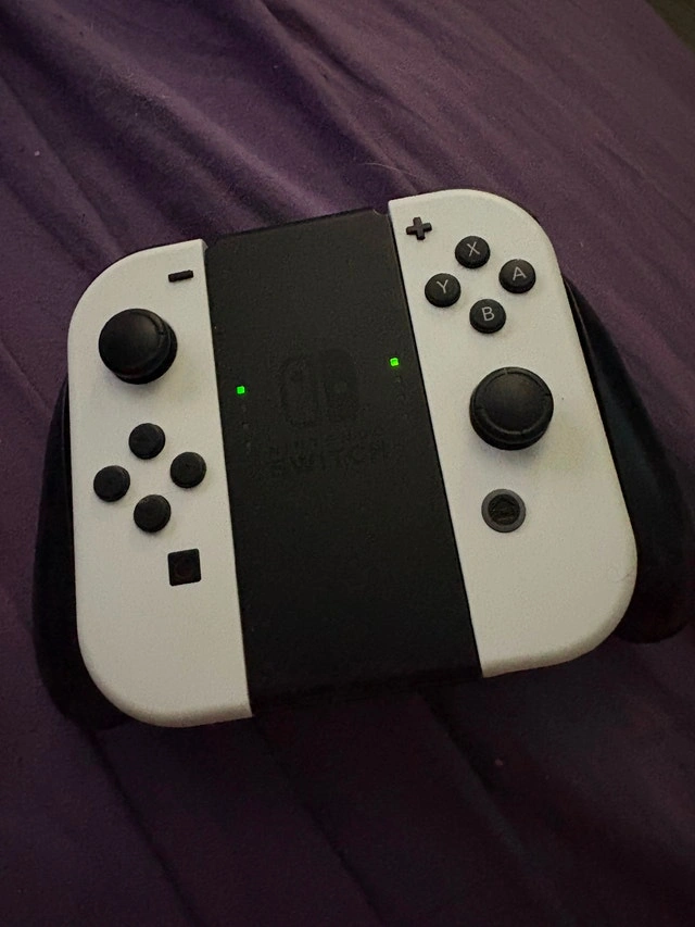 Used - Like new. Very good condition, offering gaming in 720p in handheld mode or 1080p in TV mode with a bigger OLED display. Has screen protector already installed. Comes with: Carrying Case, Attachments for Joy-Cons with straps, Charger, Joy-Con Grip, HDMI Cable, Dock.
