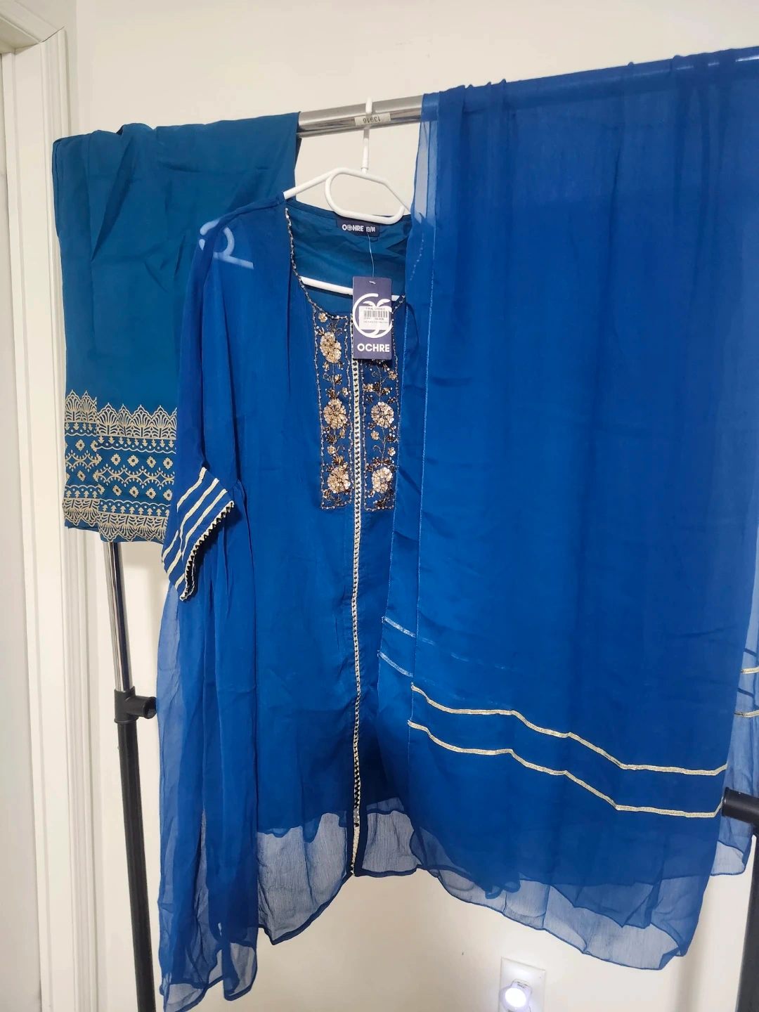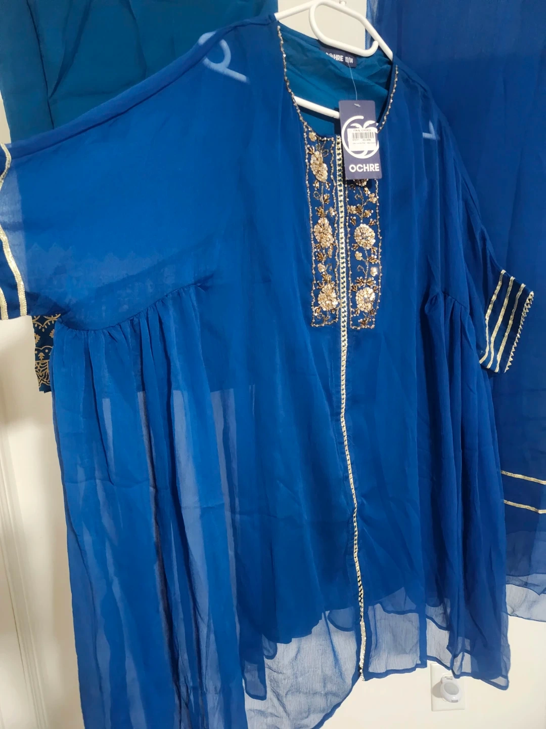 Beautiful Ochre kurti set in a vibrant blue hue. Features intricate gold embellishments on the neckline and cuffs. Comes with a matching dupatta and trousers.