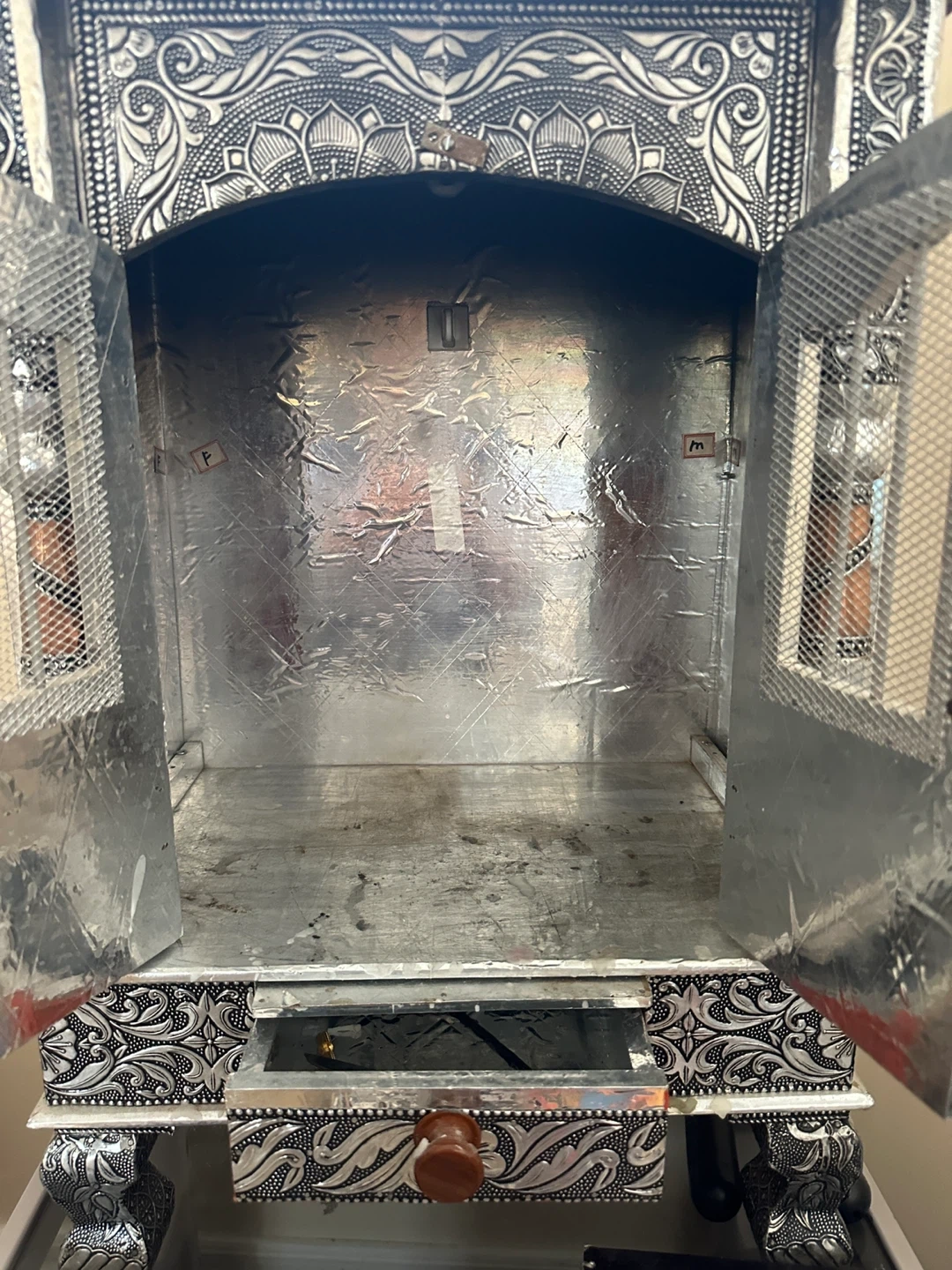 This decorative altar shelf features intricate metalwork with a silver and copper finish. It has a small drawer at the bottom for storage. It's suitable for displaying religious idols or keepsakes. The ornate design makes it a beautiful accent piece for your home!