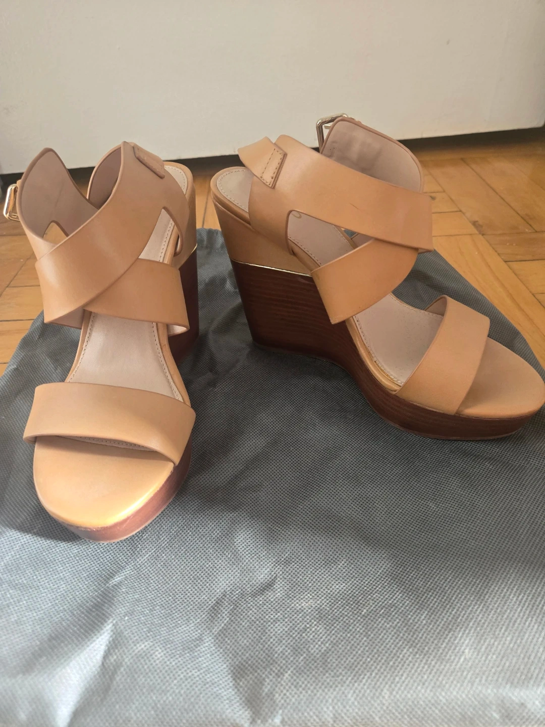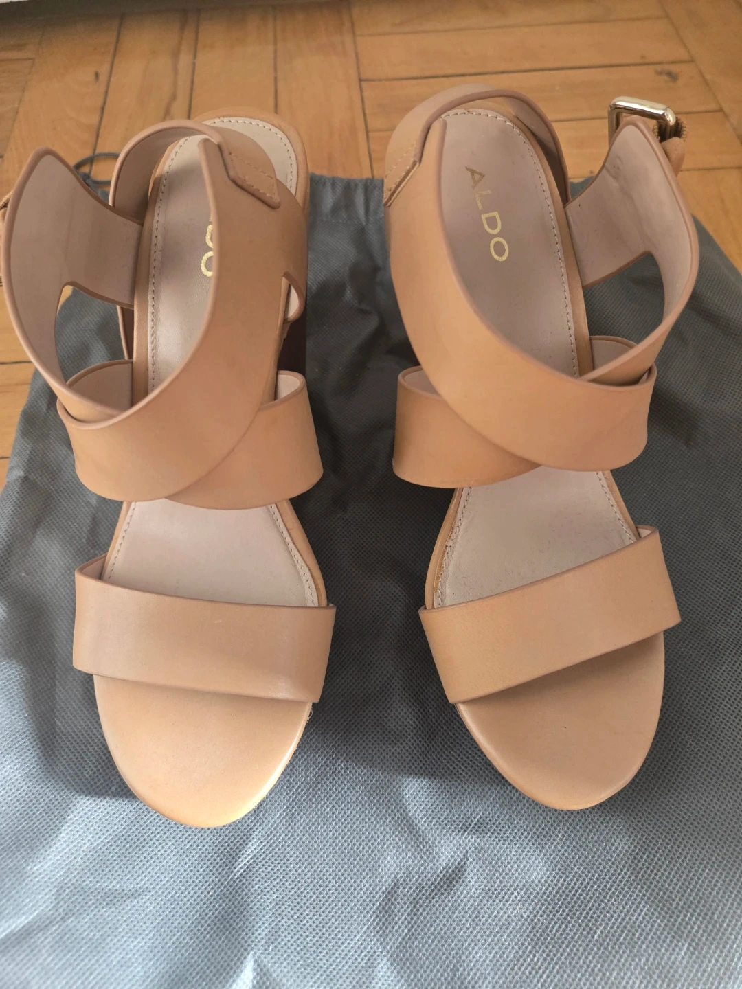 These ALDO wedge sandals feature a stylish tan leather criss-cross design. They have a comfortable wedge heel with a wood-look finish. Perfect for dressing up any summer outfit!