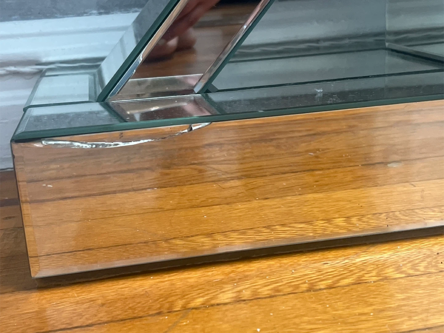 This mirrored console table features a striking X-shaped base. It's made with mirrored panels. Small chip on the front left corner of the top surface.good condition.