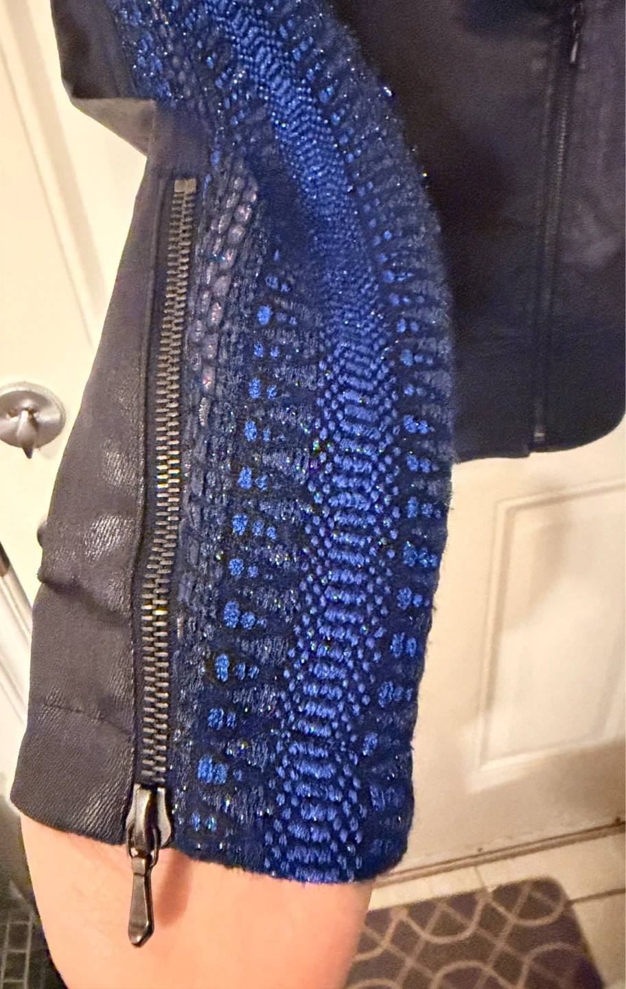 Features a black faux leather body with striking blue textured sleeves and collar detail.