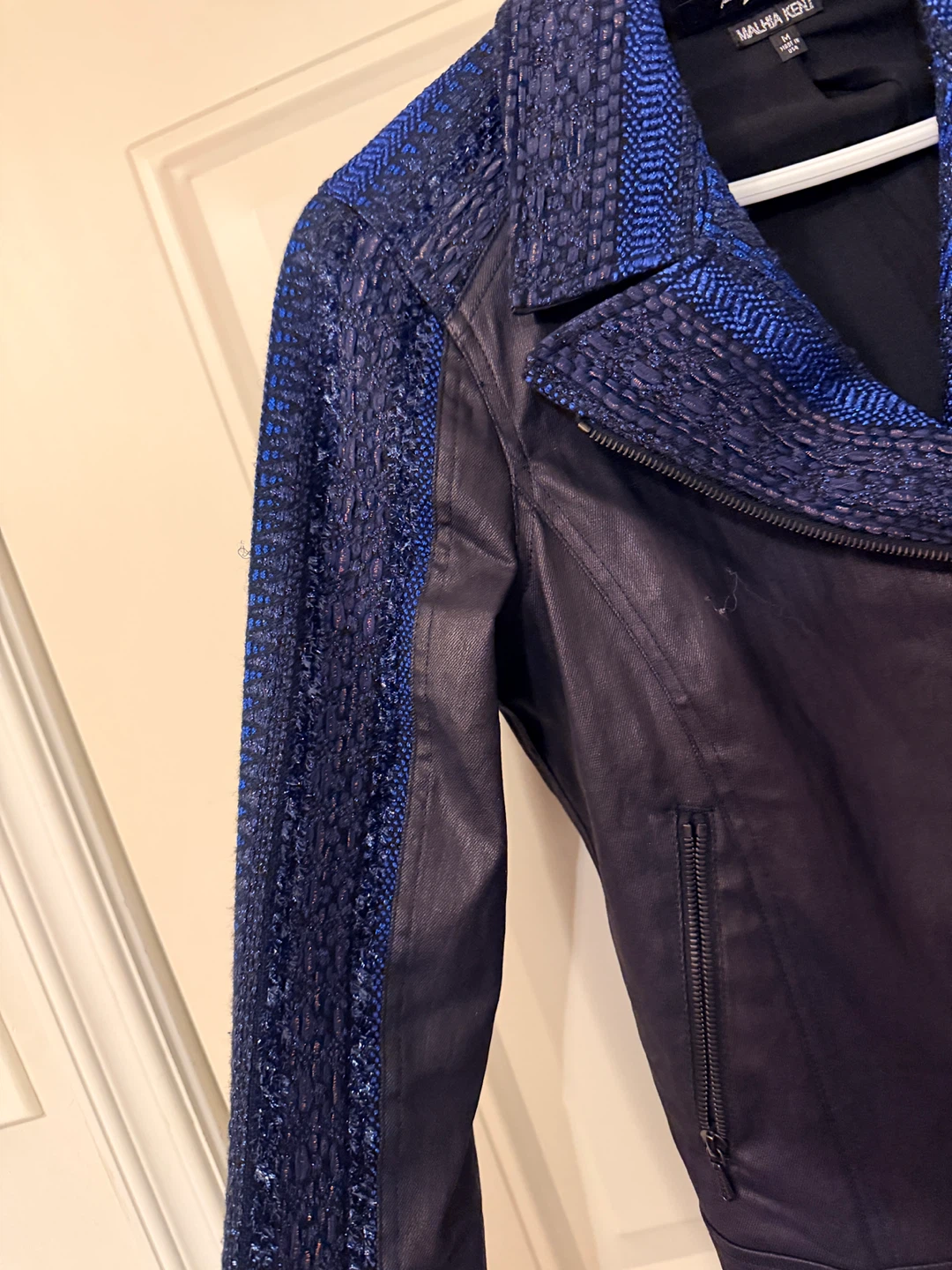 Features a black faux leather body with striking blue textured sleeves and collar detail.