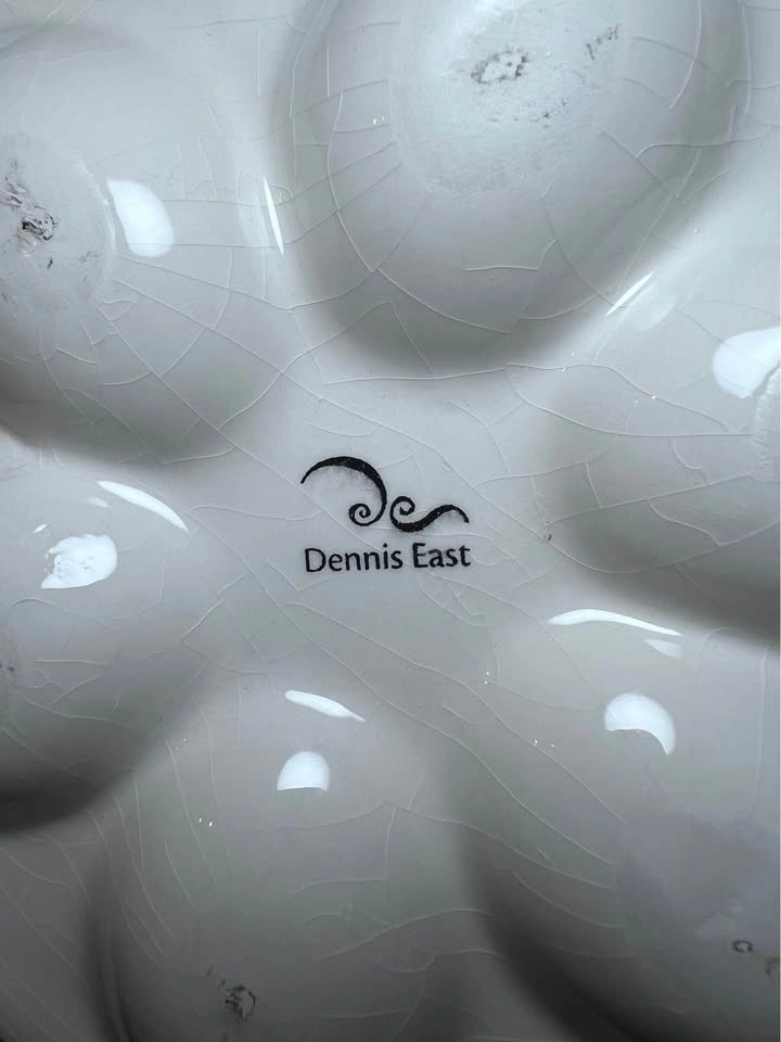 This is a Dennis East Pastel Easter Egg Spring Chicken Hen Egg Platter. It is a hand-painted ceramic platter shaped like a chicken. The platter is designed to hold six deviled eggs in the pastel-colored (pink and green) wells. It measures approximately 9 inches long and 9.75 inches wide. The item is considered a collectible and can also be used as a decorative piece or for serving snacks. Preowned - small chip on underside of head as shown in photo Pickup is 58th and 7th Ave in midtown Manhattan