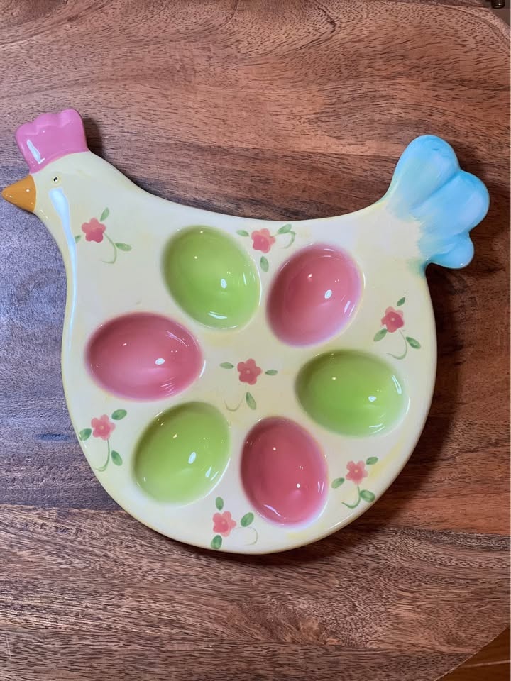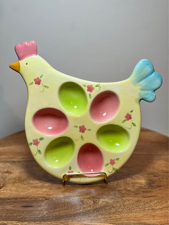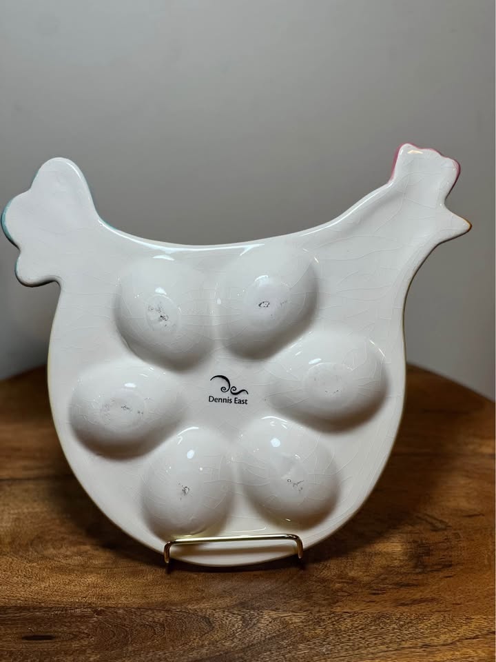 This is a Dennis East Pastel Easter Egg Spring Chicken Hen Egg Platter. It is a hand-painted ceramic platter shaped like a chicken. The platter is designed to hold six deviled eggs in the pastel-colored (pink and green) wells. It measures approximately 9 inches long and 9.75 inches wide. The item is considered a collectible and can also be used as a decorative piece or for serving snacks. Preowned - small chip on underside of head as shown in photo Pickup is 58th and 7th Ave in midtown Manhattan