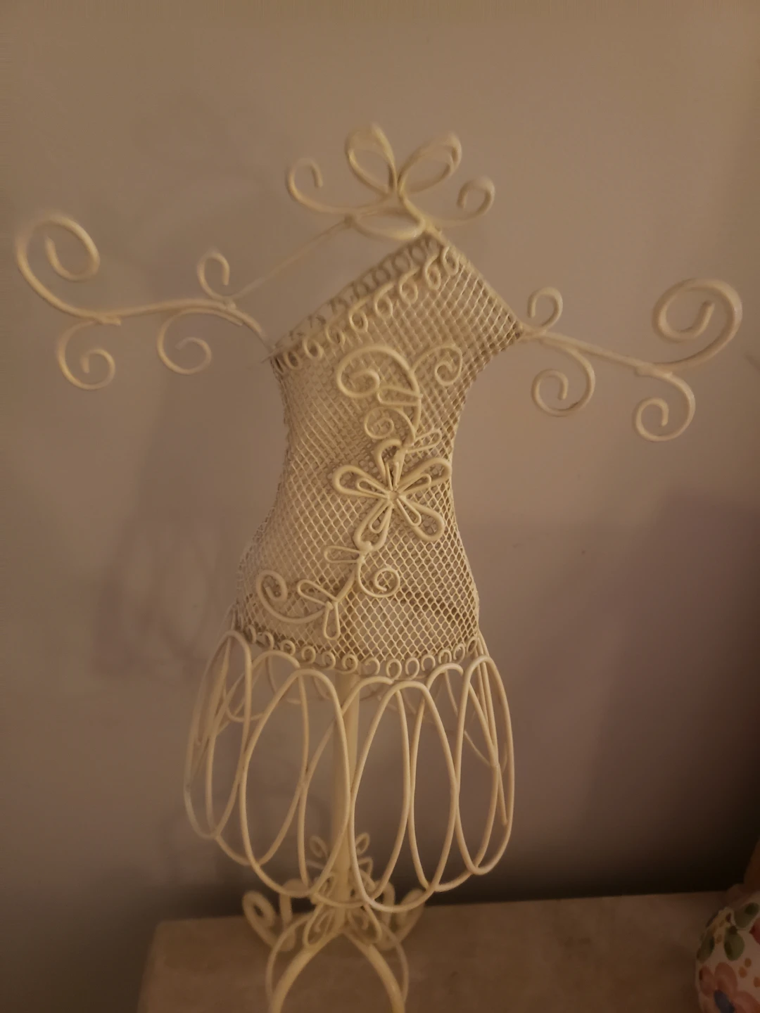This decorative dress form display stand is made of metal wire. It has a cream-white finish and features an ornate floral design. This stand is perfect for displaying jewellery or small accessories.