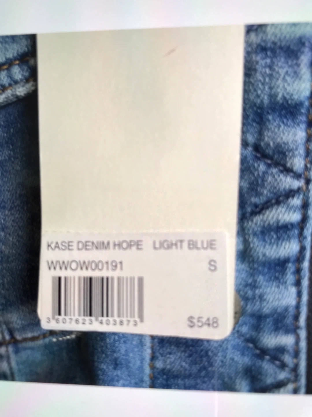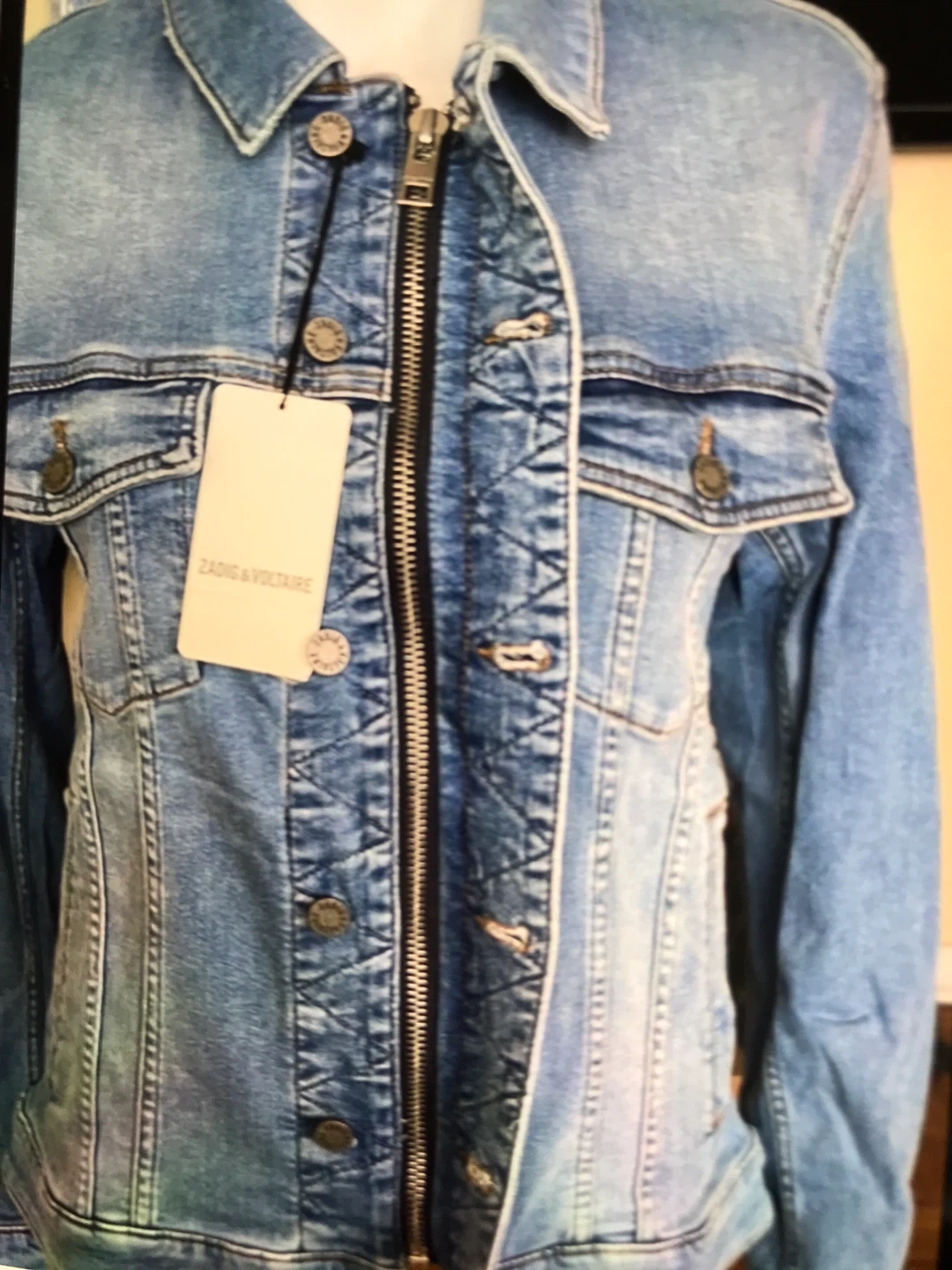 This Zadig & Voltaire denim jacket features the "I HOPE I THINK I KNOW" graphic on the back. It's a light blue wash with a zip-up front and button closures. Made in Tunisia. Size S.