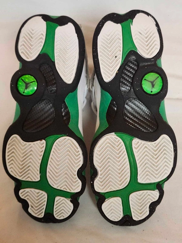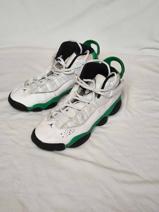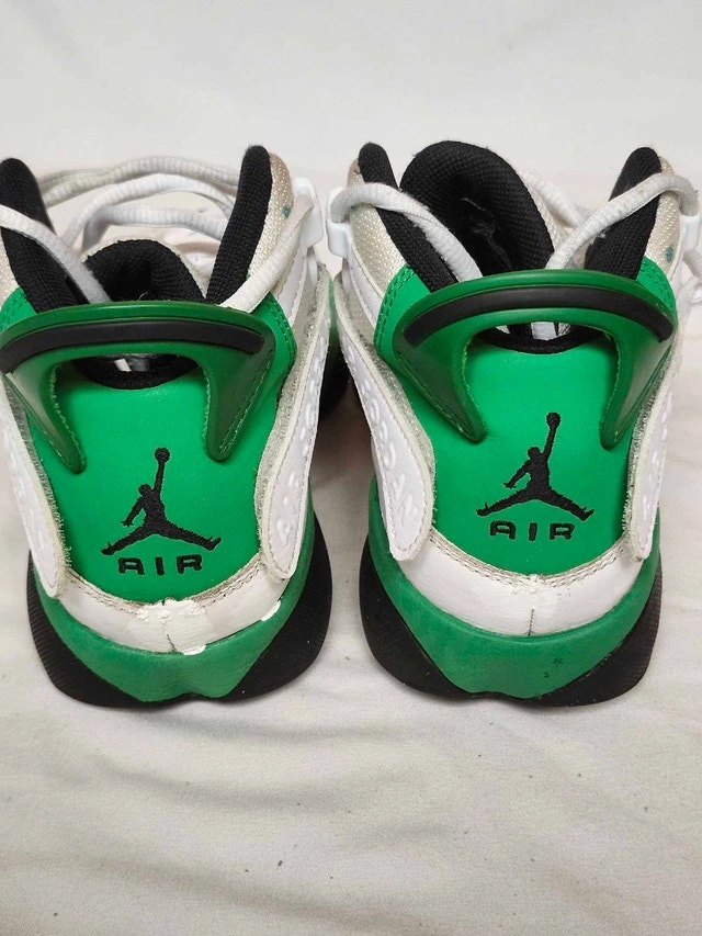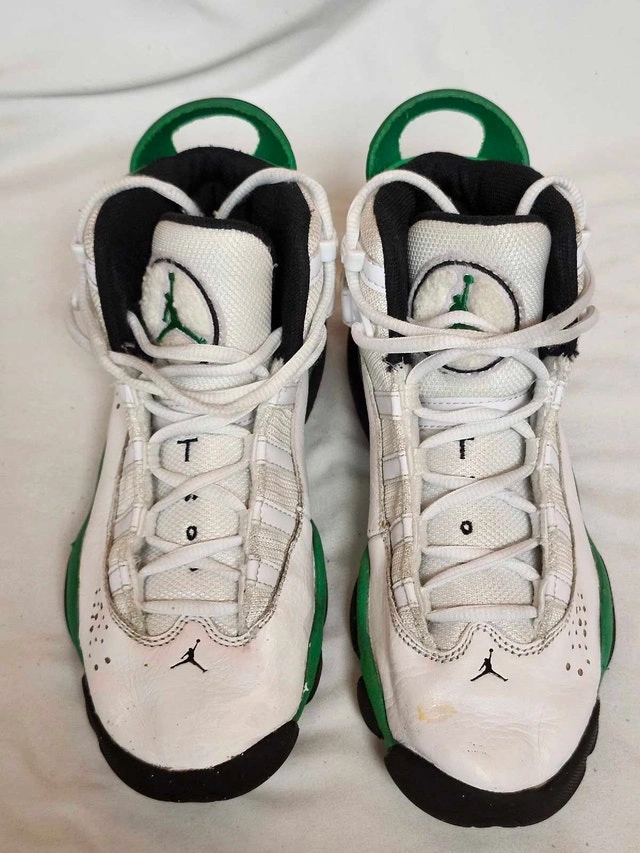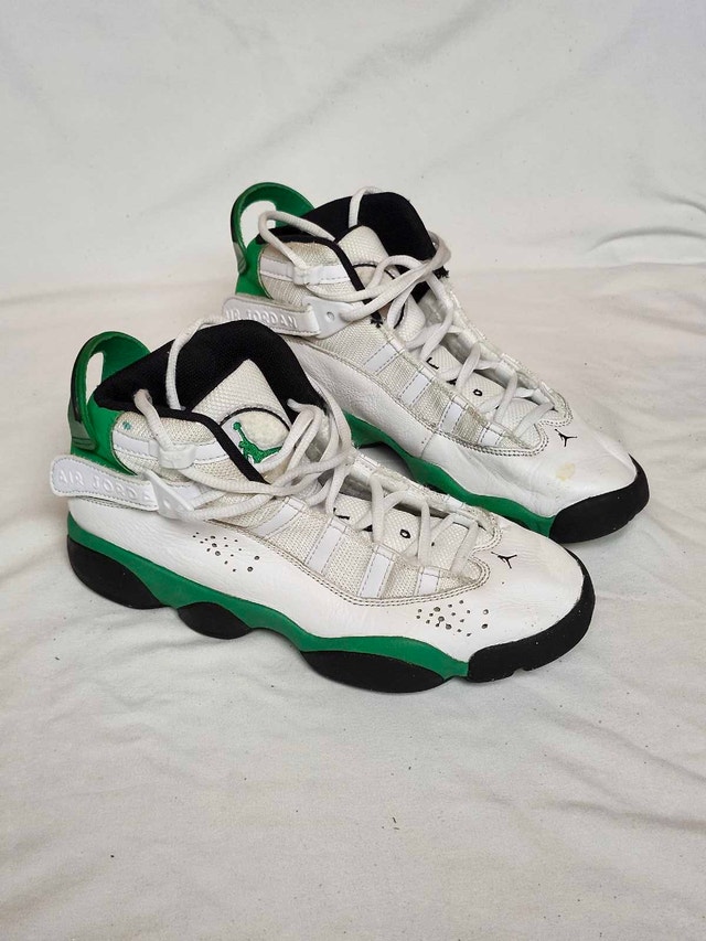 Step up your game with these Air Jordan 6 Rings in the "Lucky Green" colourway, a youth size 4, showing some signs of wear, as seen in the photos. These shoes combine elements from each of the shoes Michael Jordan wore during his championship years, creating a unique hybrid design that's sure to turn heads. Perfect for young athletes and Jordan fans alike! Brand: Air Jordan Model: 6 Rings Colour: White/Lucky Green/Black Style Code: 323419-103 Size: Youth 4 These shoes are looking for a new home and are patiently waiting for you to make them yours! If the ad is still up, then yes, this item is still available!