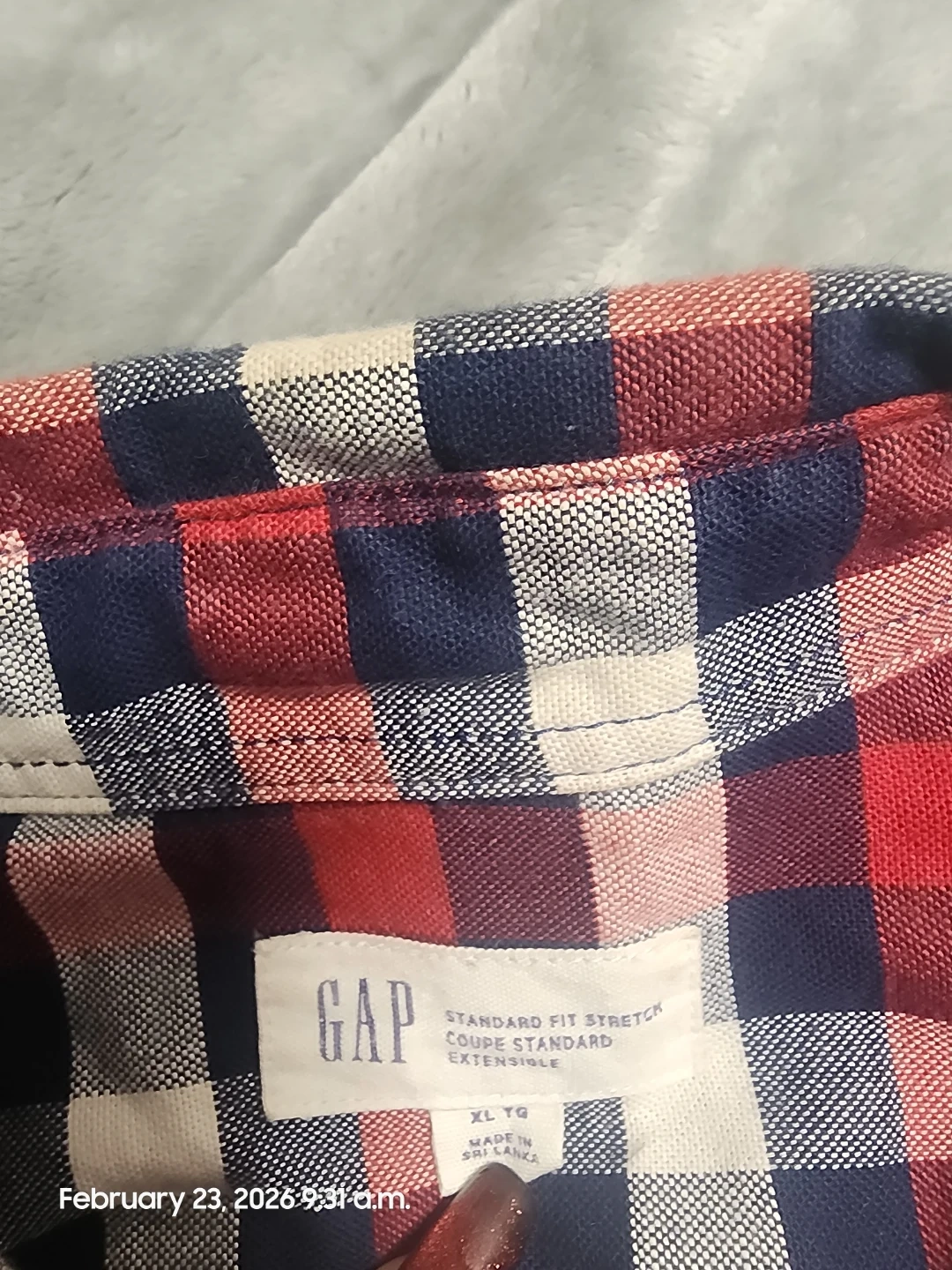 This is a GAP long-sleeve button-up shirt. It's a standard fit and made of a stretch fabric. The shirt is XL and was made in Sri Lanka. It features a red, white, and blue plaid pattern.