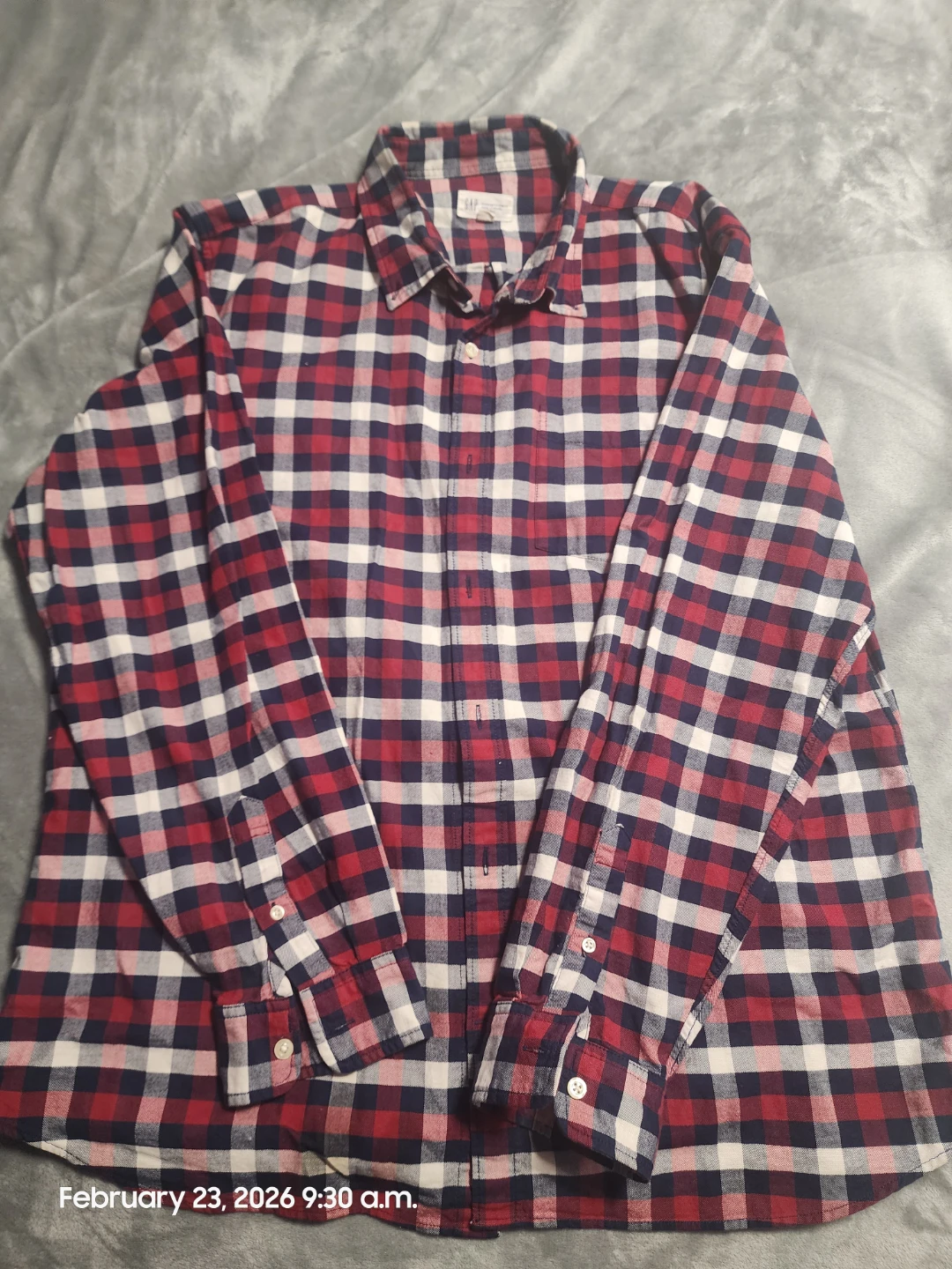 This is a GAP long-sleeve button-up shirt. It's a standard fit and made of a stretch fabric. The shirt is XL and was made in Sri Lanka. It features a red, white, and blue plaid pattern.