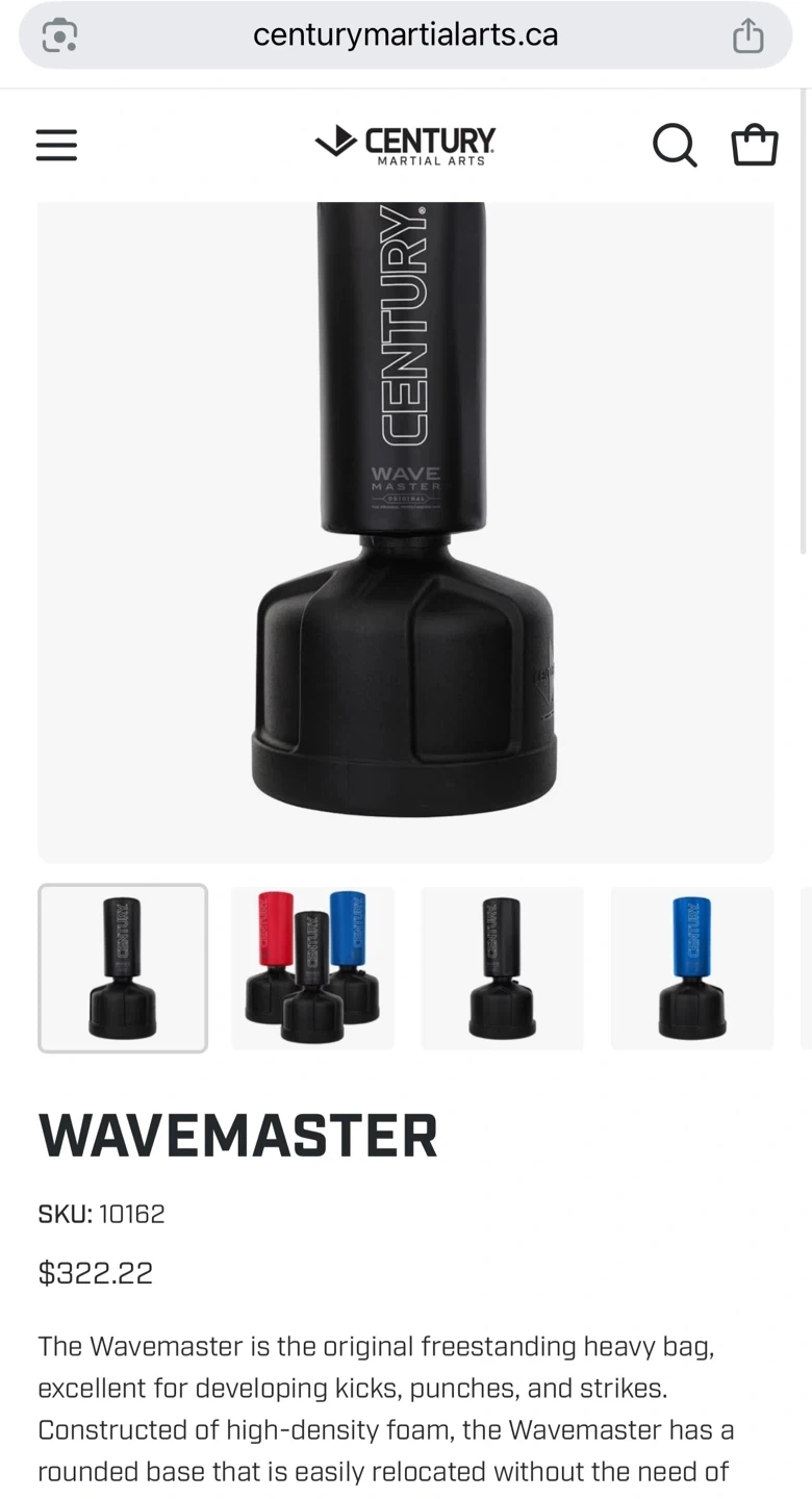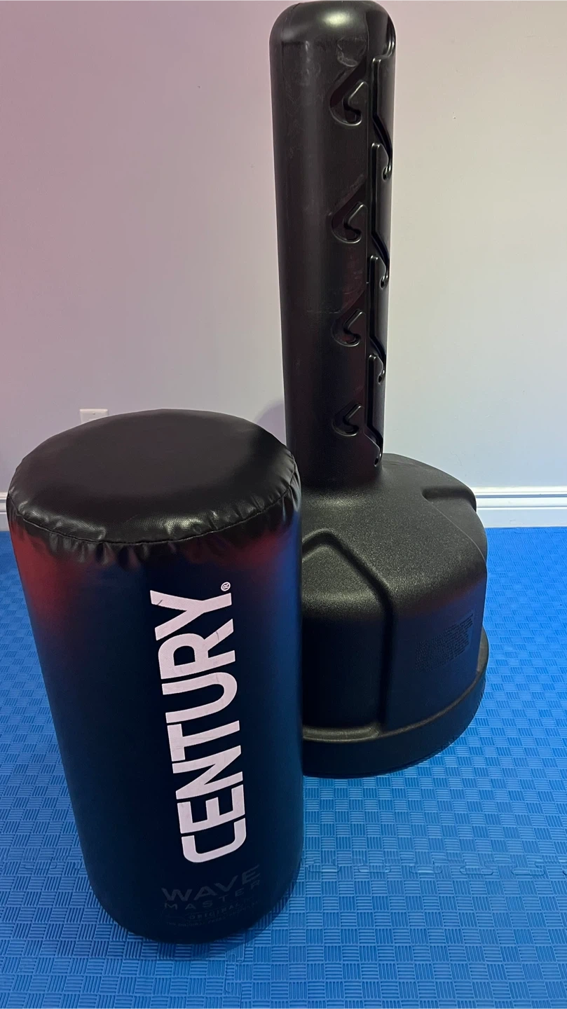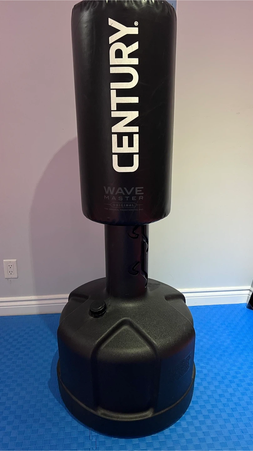 This Century Wavemaster Original is a freestanding heavy bag designed for developing kicks, punches, and strikes. It has a striking surface measuring 13" diameter x 26" tall. The base is 24" diameter x 19.5" tall and can be filled with water for stability, holding approx. 270 lbs. when filled. This bag is excellent for training at home!