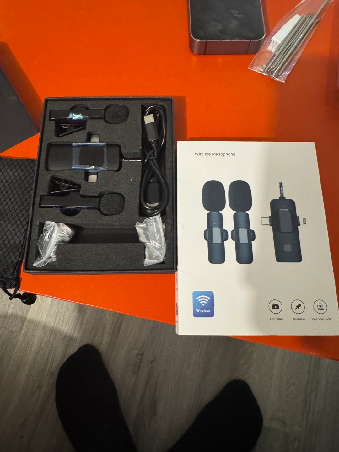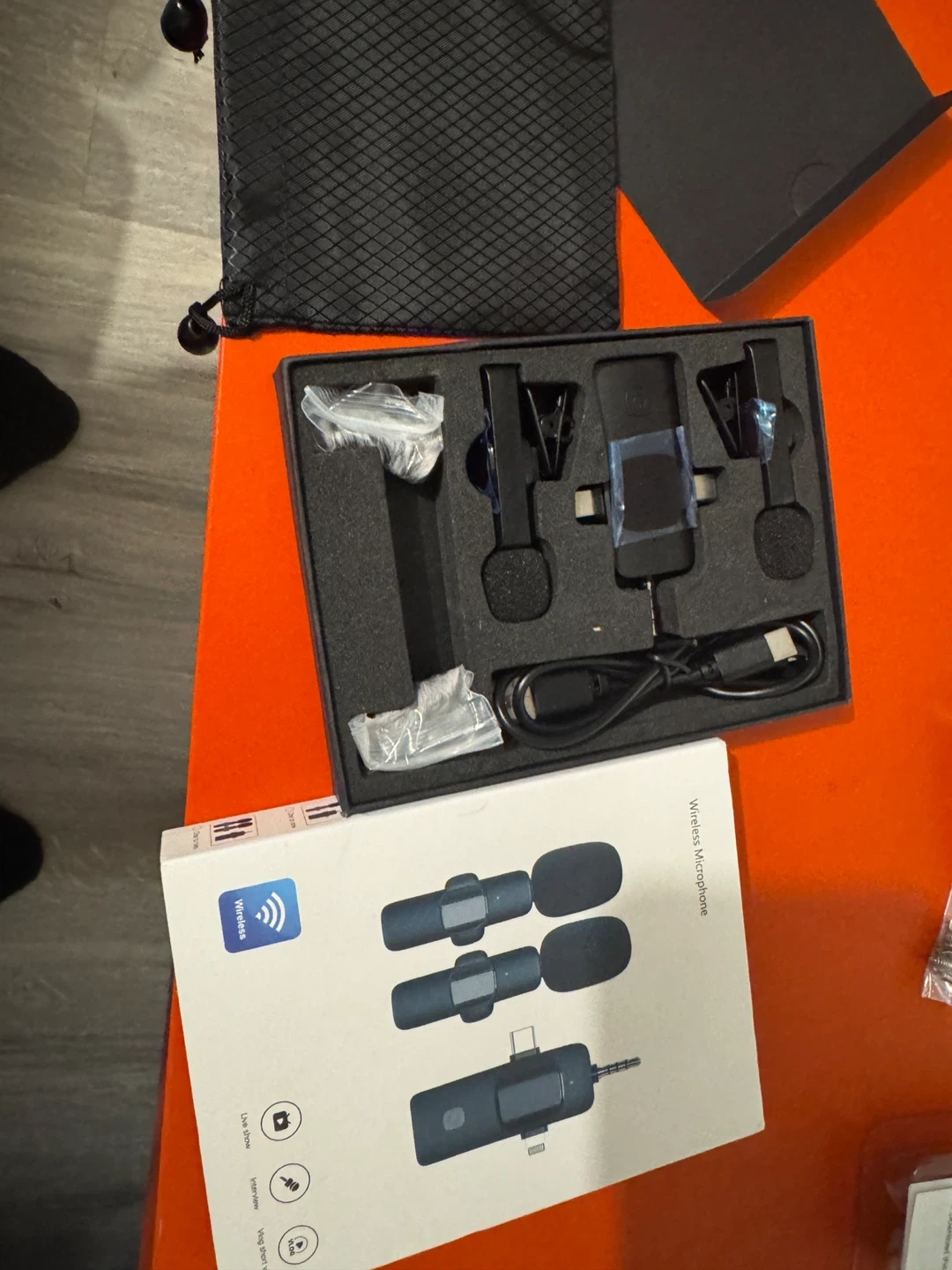 This is a wireless microphone set, including two clip-on mics and a receiver. It comes with a charging cable and a carrying pouch. Great for live shows, interviews, and vlogging!