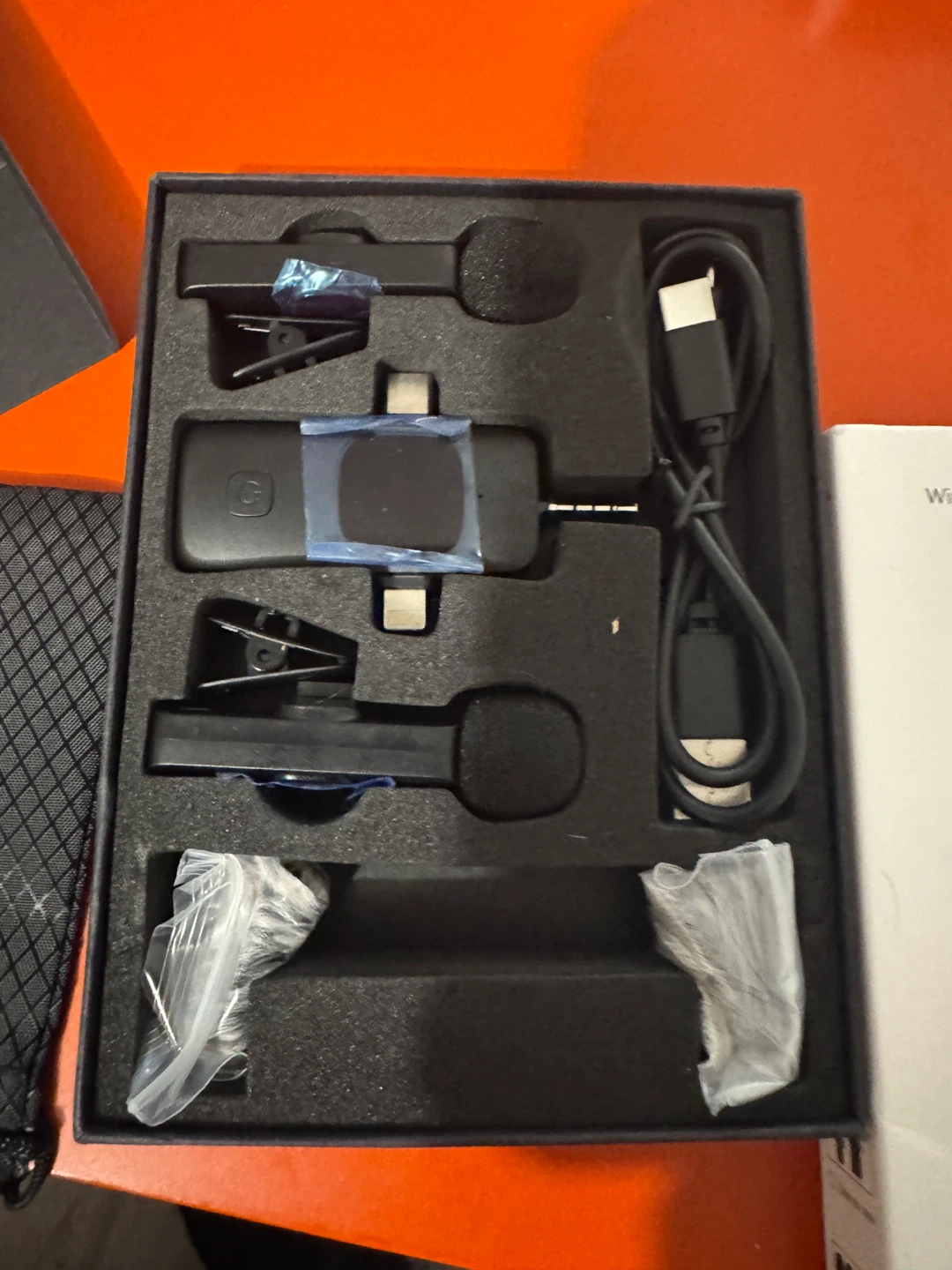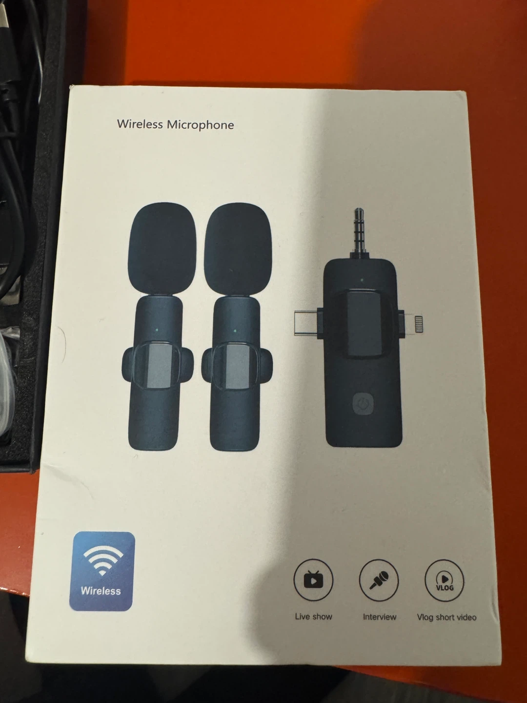 This is a wireless microphone set, including two clip-on mics and a receiver. It comes with a charging cable and a carrying pouch. Great for live shows, interviews, and vlogging!