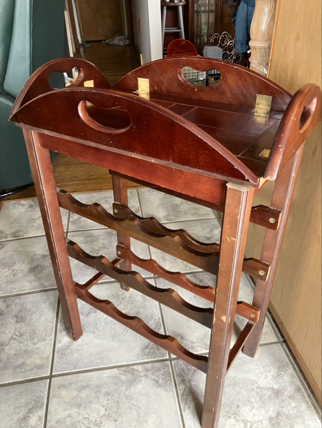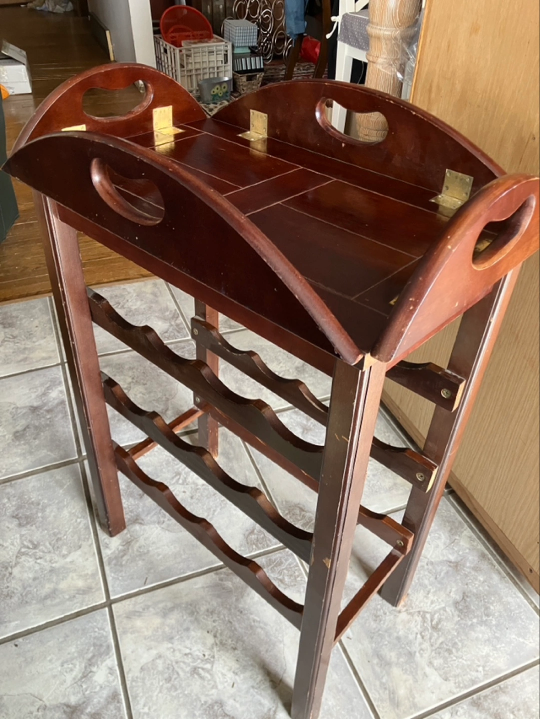 Dark brown wooden wine rack. Features a removable serving tray with brass hinges. Holds approximately six bottles of wine. Some minor wear and tear.