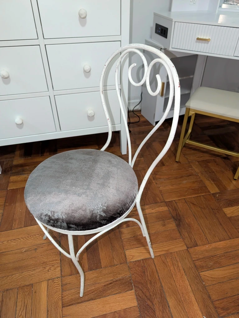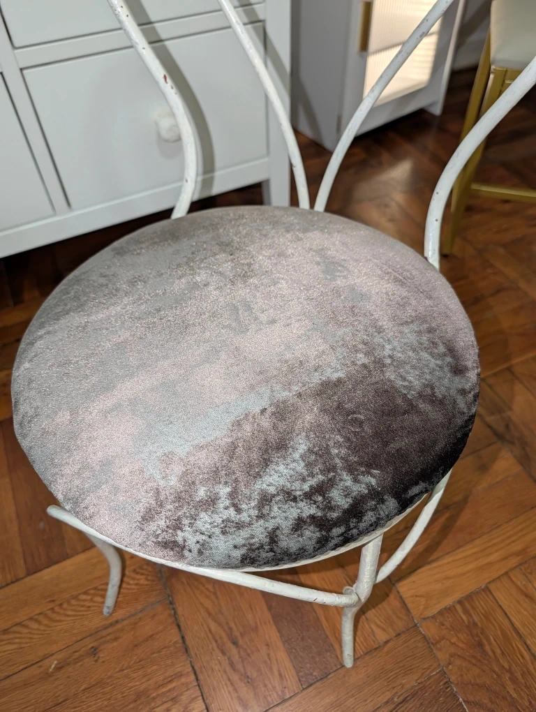 Giving away a vintage-style chair with a white metal frame and a round, cushioned seat. The seat has a unique mottled pattern, and there is one dark dot on the seat, as pictured. It would be a charming addition to any room!