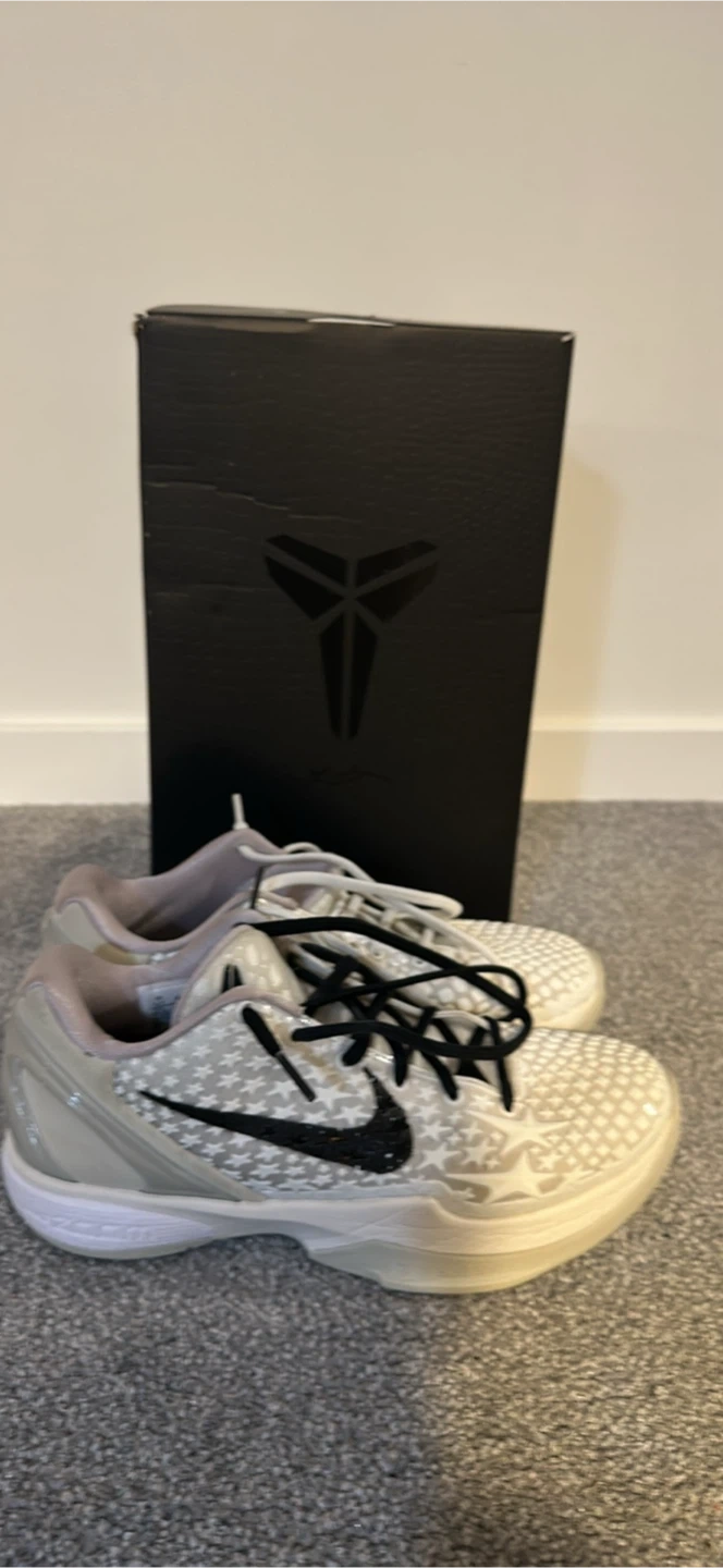 These Nike Kobe 6 Protro sneakers come with their original box and two extra pairs of laces. They're in a light grey colourway with a black and white speckled pattern. The shoes feature a rubber sole with a unique tread pattern for grip.size 6.5 worn twice trades work also