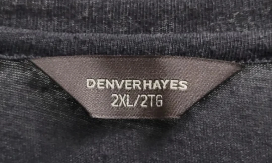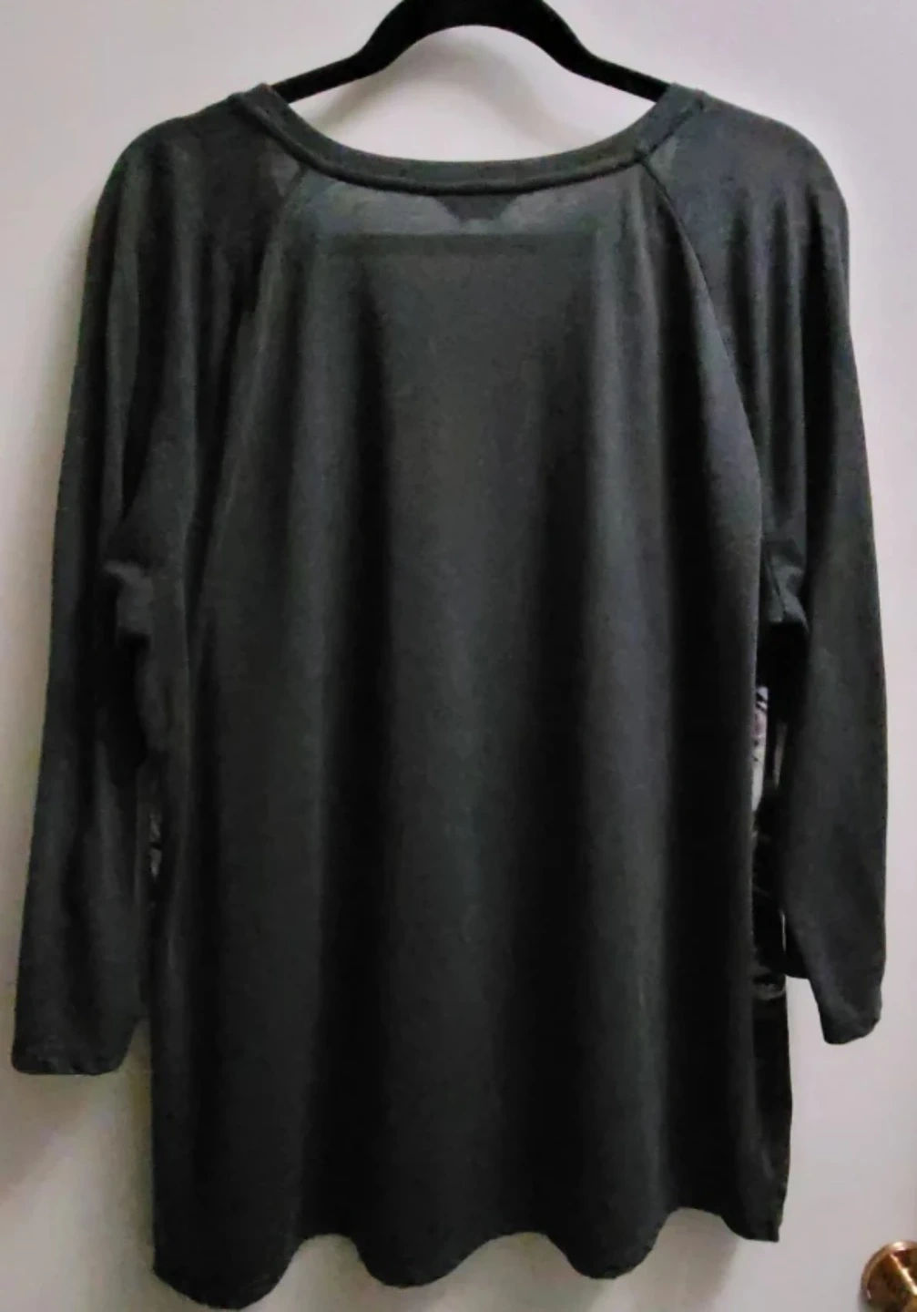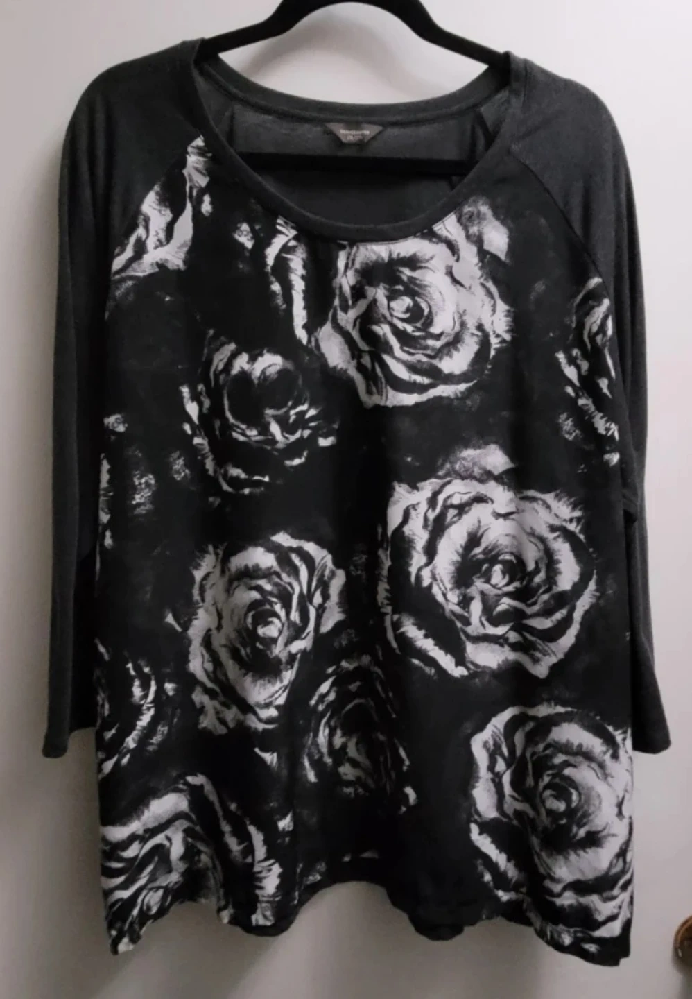 This Denver Hayes top features a charcoal grey raglan sleeve design with a bold black and white rose print on the front. It's a size 2XL. This comfortable top is great for casual wear. Silky front and jersey knit back.