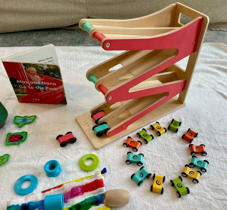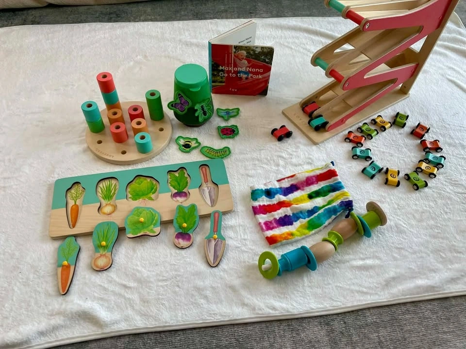 Give your busy toddler the play they crave! This kit helps build two-handed coordination, improve finger strength, and introduce empathy. Includes a Race & Chase Ramp with 12 extra cars, 'Max and Nana Go to the Park' board book about managing emotions, a Threadable Bead Kit for fine motor skills, a Drawstring Bag, a Wooden Stacking Pegboard, a Community Garden Vegetable Puzzle to practice pincer grasp, and a Fuzzy Bug Shrub with Velcro critters. Play Guide is not included.