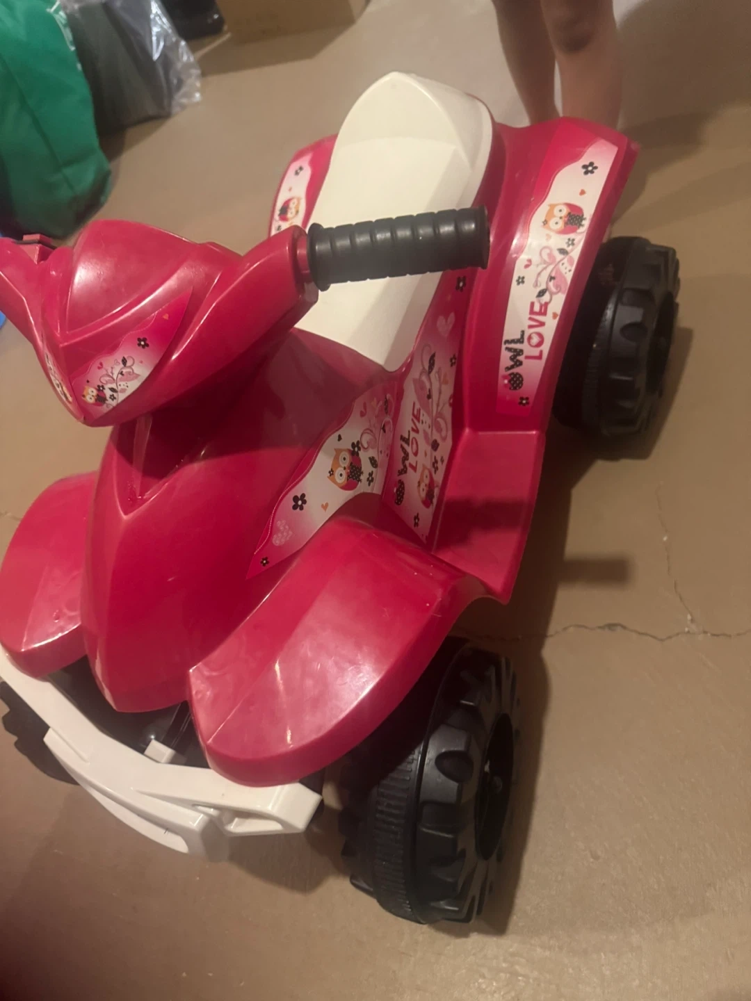 This is a fun pink ride-on ATV for kids! It features cute owl and heart decals with 'OWL LOVE' text. Durable plastic construction with sturdy wheels for indoor or outdoor play. A great way for little ones to zoom around!