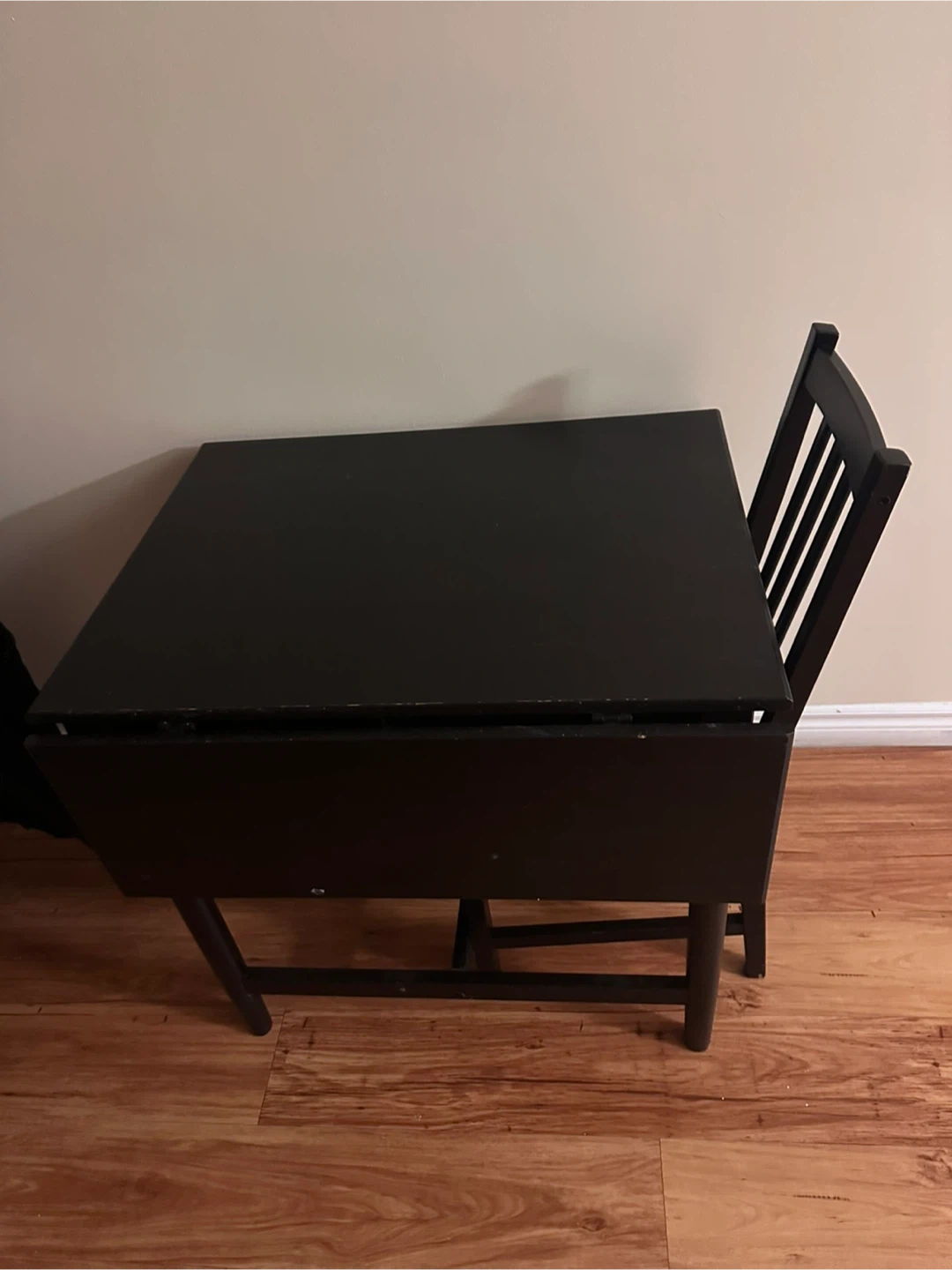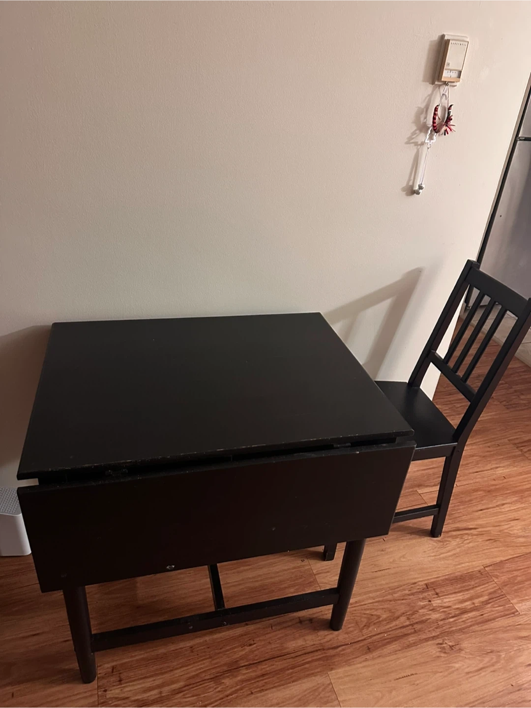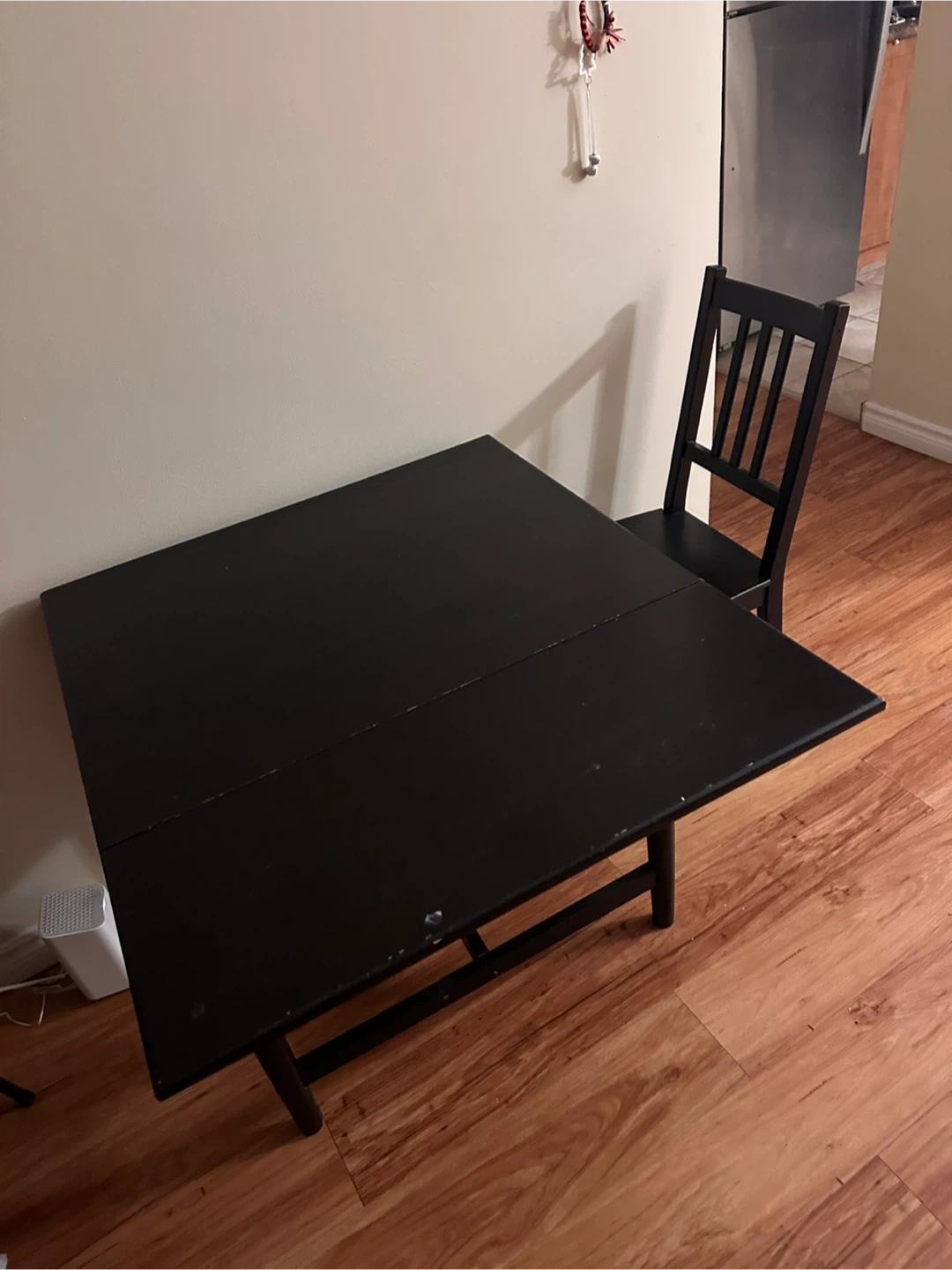 This black drop-leaf table and chair set is perfect for smaller spaces. It's made of wood and offers a convenient dining or workspace solution. The table's sides can be folded down to save room when not in use.