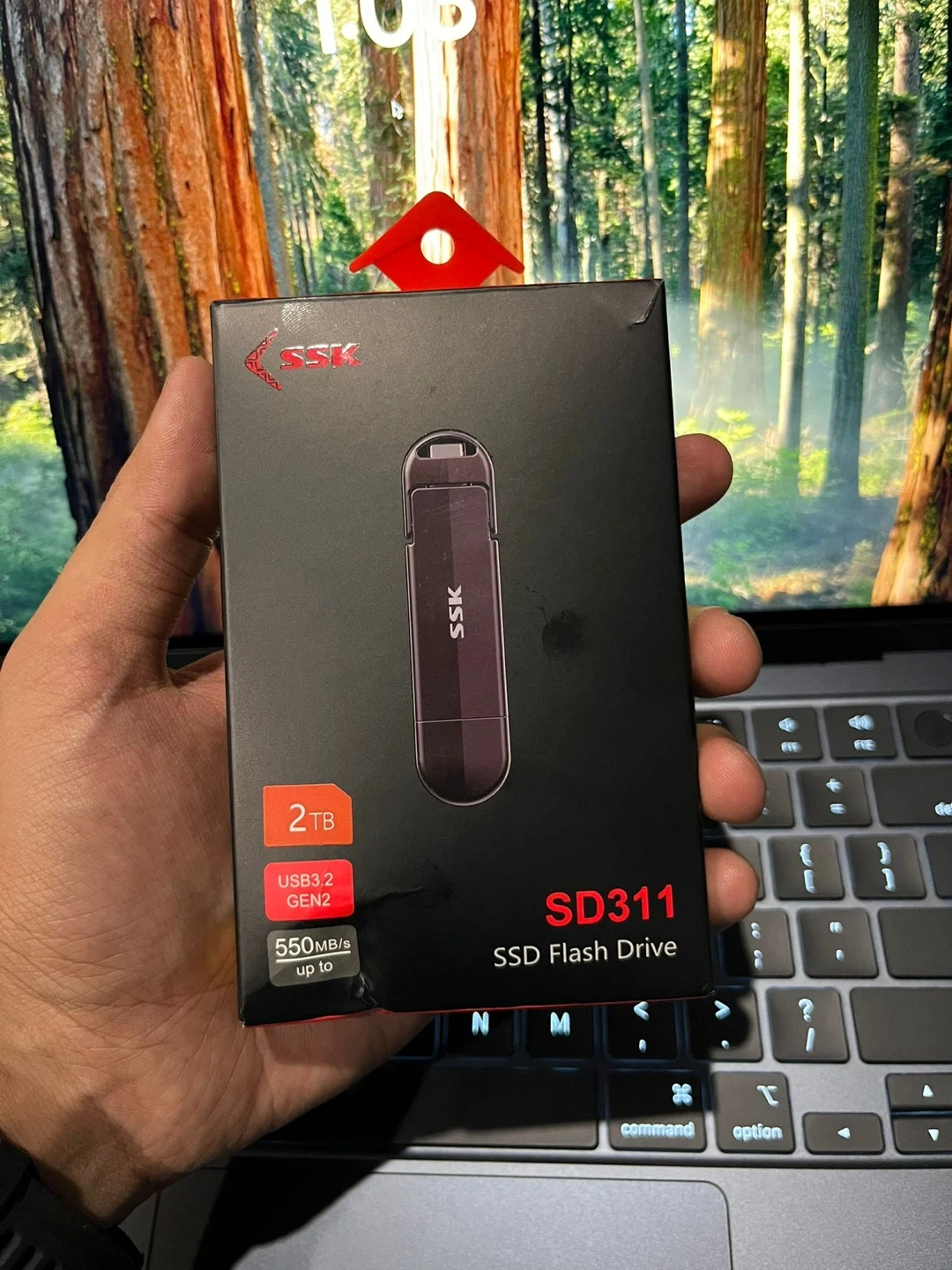 SSK 2TB SSD flash drive with USB 3.2 Gen 2. Utilizes SATA protocol and offers high-speed read/write up to 550 MB/s. It has dual interfaces of USB-C & USB-A for versatile compatibility. This drive is great for transferring large files quickly!