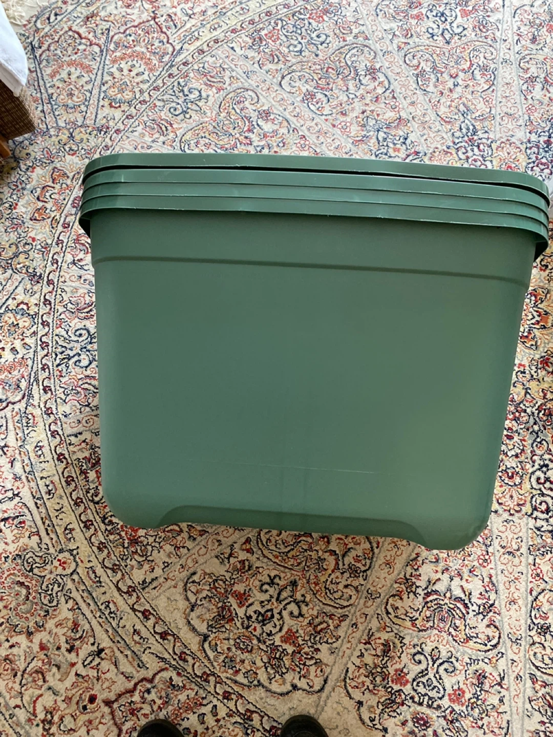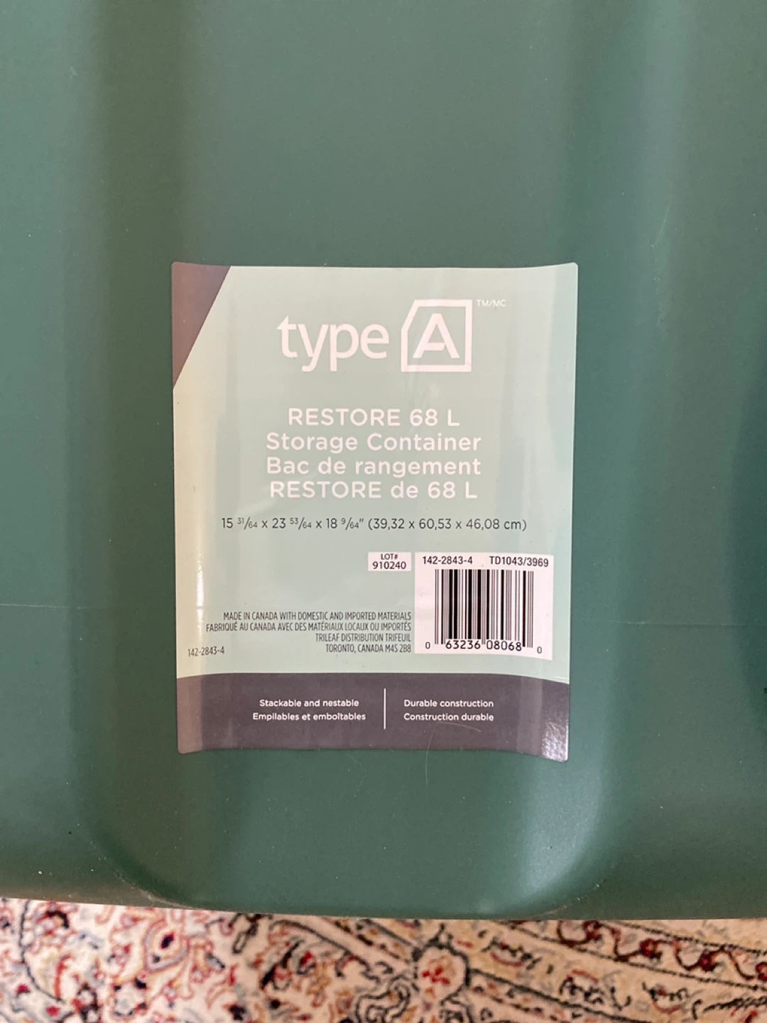 This is a type A 68 L storage container. It's a dark green color and measures 15 5/8" x 23 5/8" x 18 5/8". The container is stackable, nestable, and has durable construction. It's suitable for organizing various items.