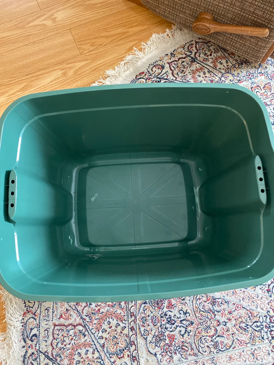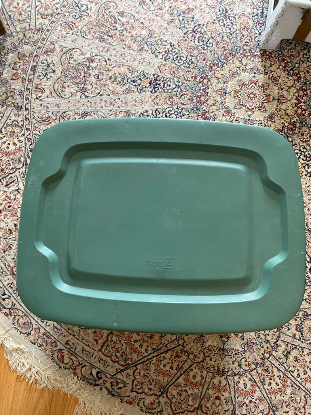 This is a type A 68 L storage container. It's a dark green color and measures 15 5/8" x 23 5/8" x 18 5/8". The container is stackable, nestable, and has durable construction. It's suitable for organizing various items.