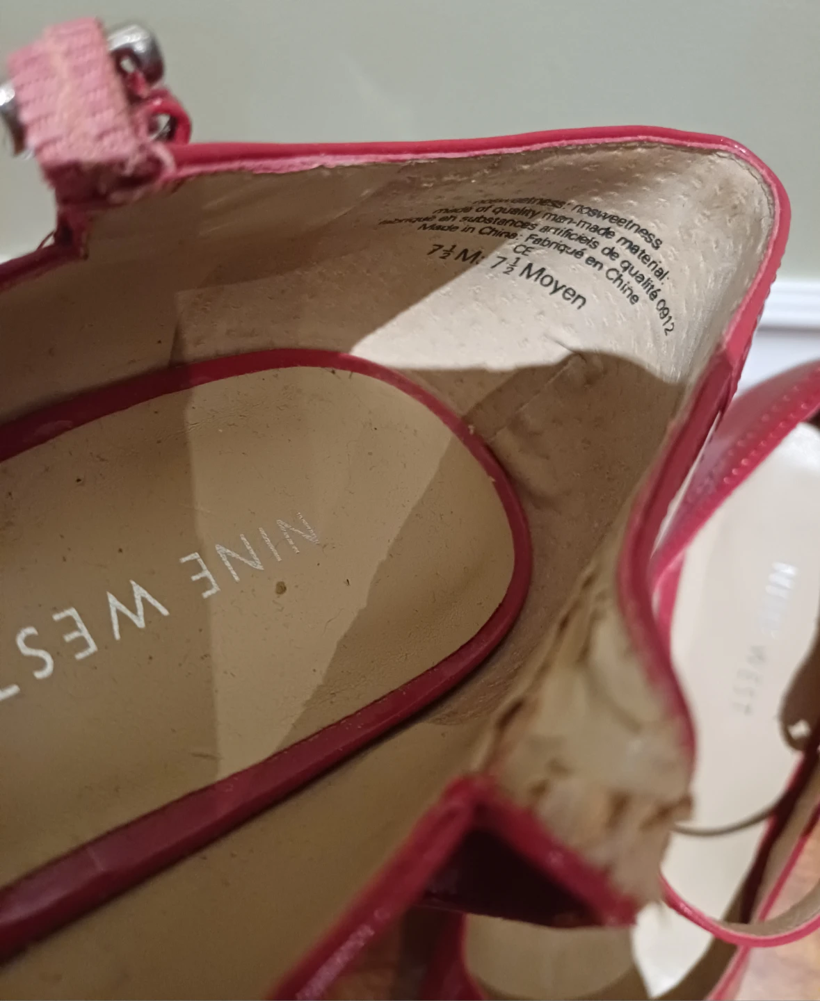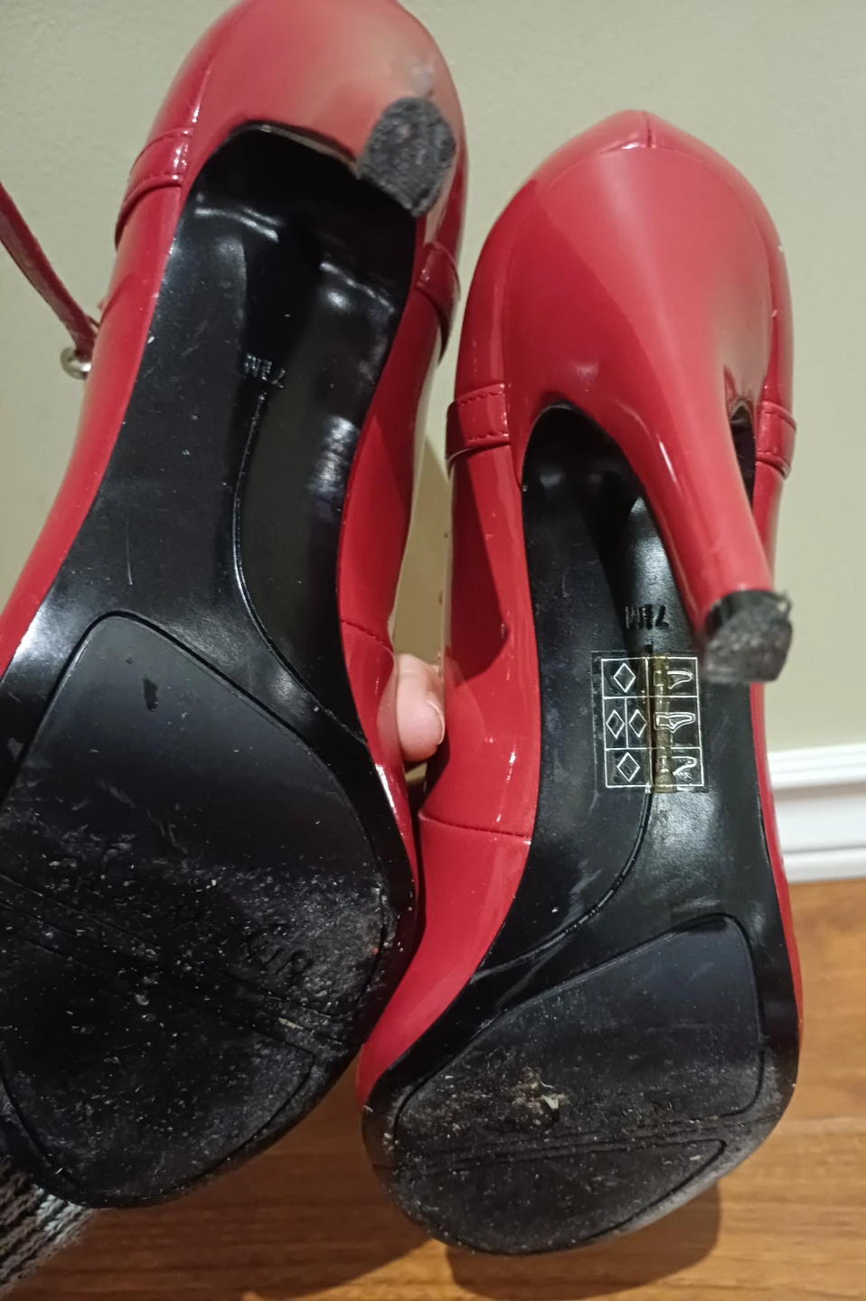 FREE Shiny red patent leather Mary Jane heels from Nine West. Some wear and tear on the inside lining as pictured. Heel height is approximately 4 inches.