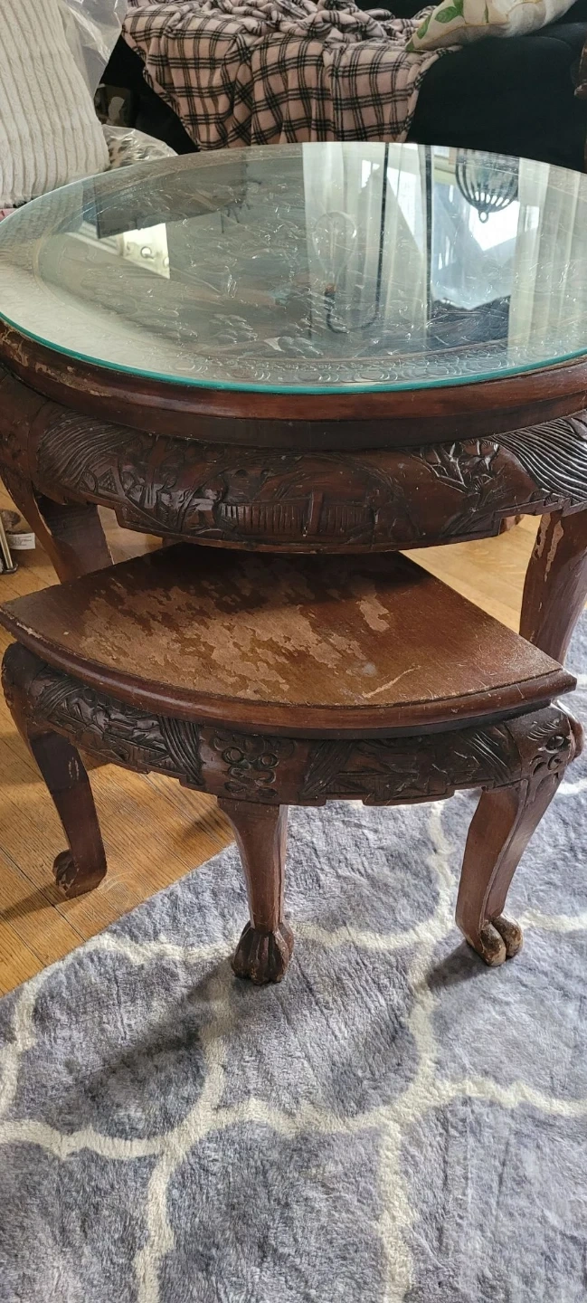 Vintage Carved Wood Nesting Tables with Glass Tops