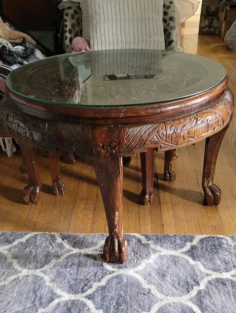 Beautiful set of vintage carved wooden nesting tables. Each table has claw feet and a glass top. The wood carving details are intricate. Some wear on the wood finish consistent with age.