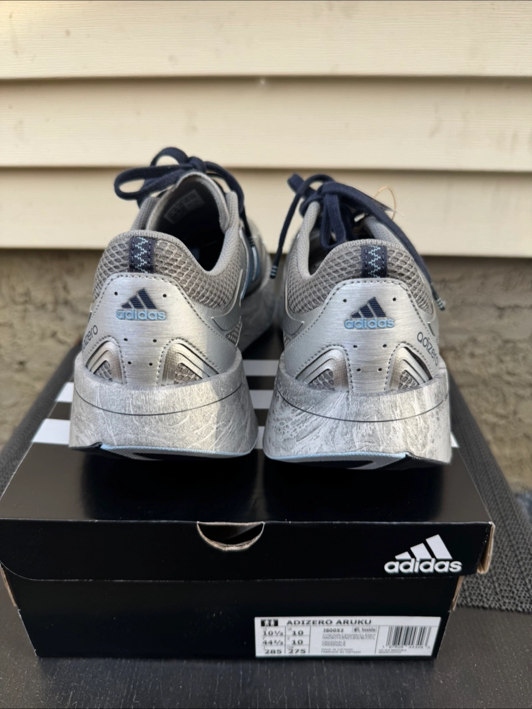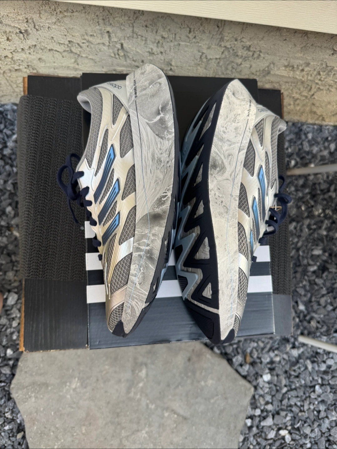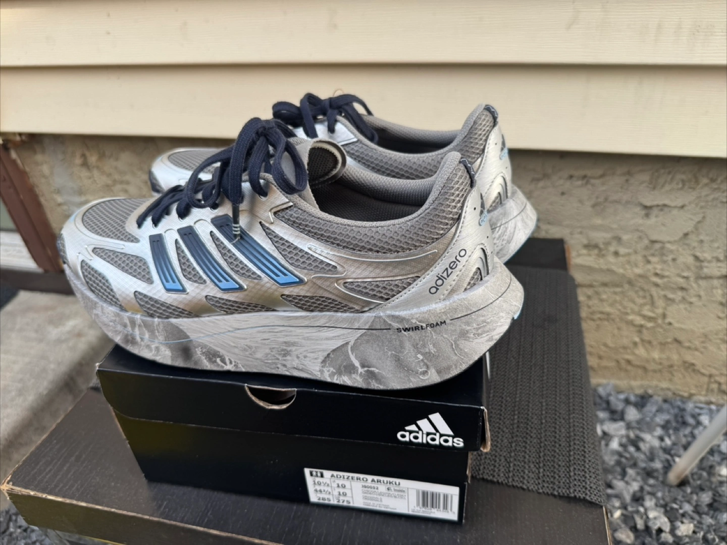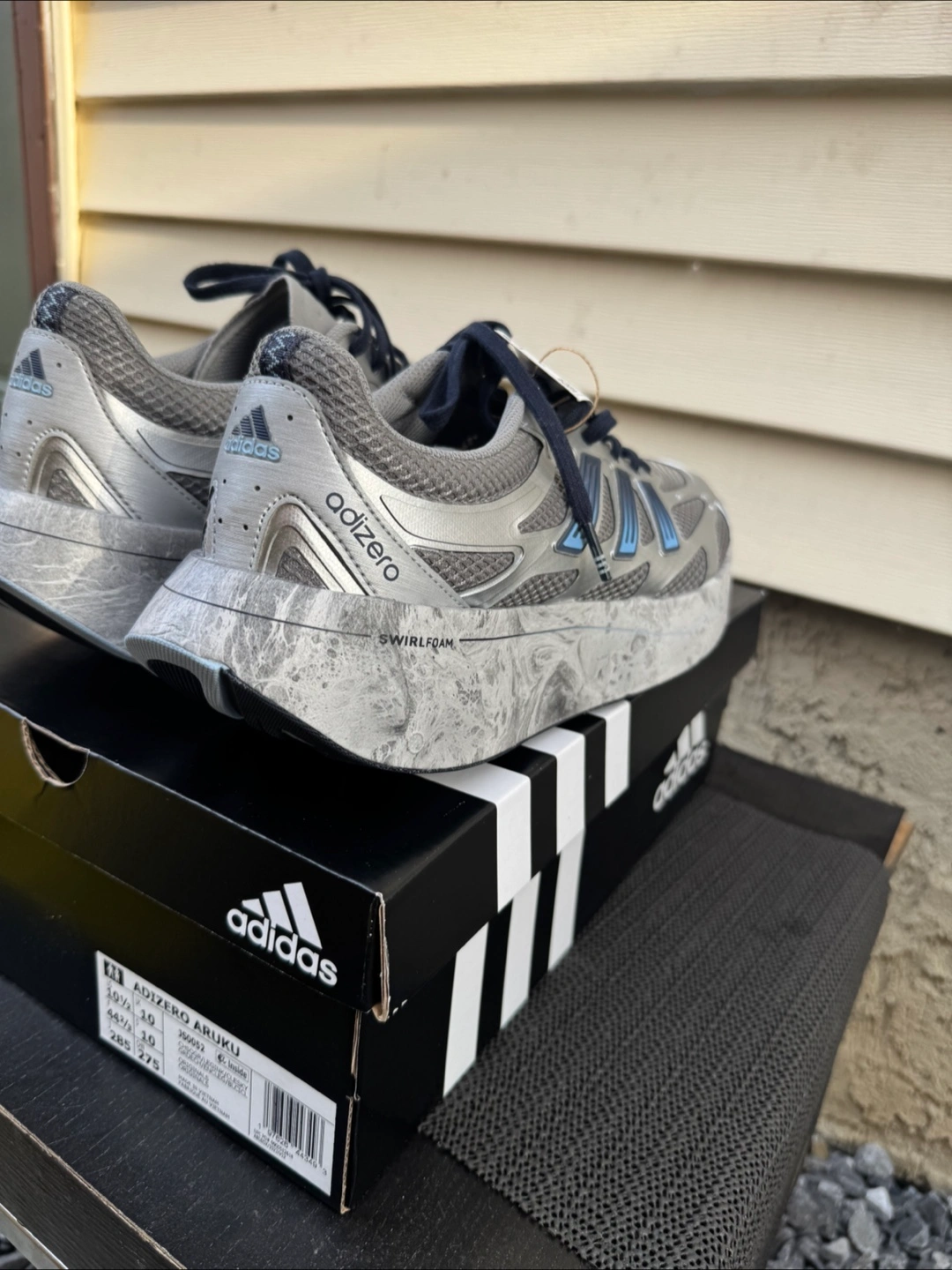 Selling a Brand new pair of Adidas Adizero Aruku sneakers in silver and blue! They're a US size 10.5 and come with the original box. These runners feature a unique swirl foam design on the soles, making them stand out. Great for running or casual wear!