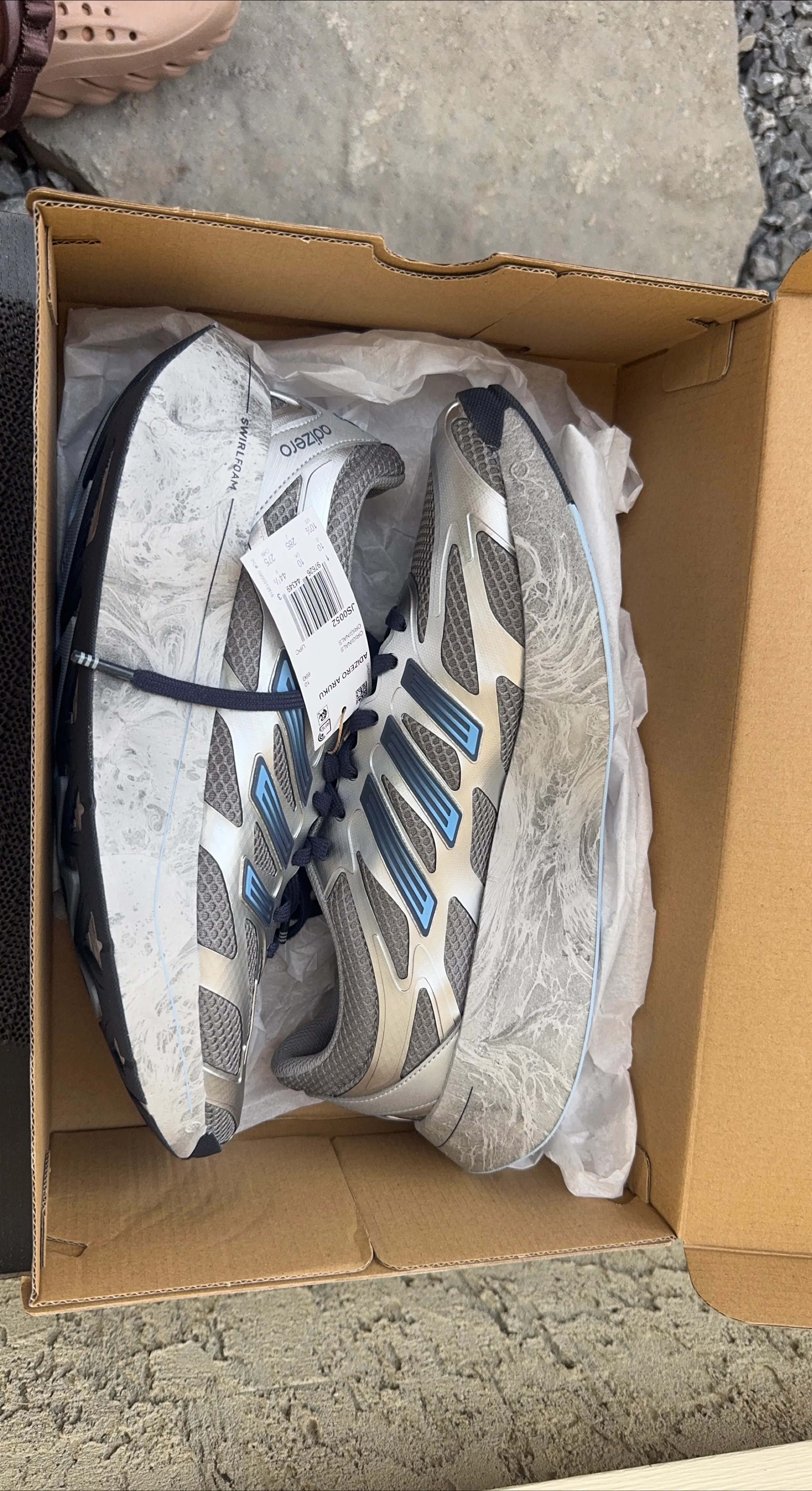 Selling a Brand new pair of Adidas Adizero Aruku sneakers in silver and blue! They're a US size 10.5 and come with the original box. These runners feature a unique swirl foam design on the soles, making them stand out. Great for running or casual wear!
