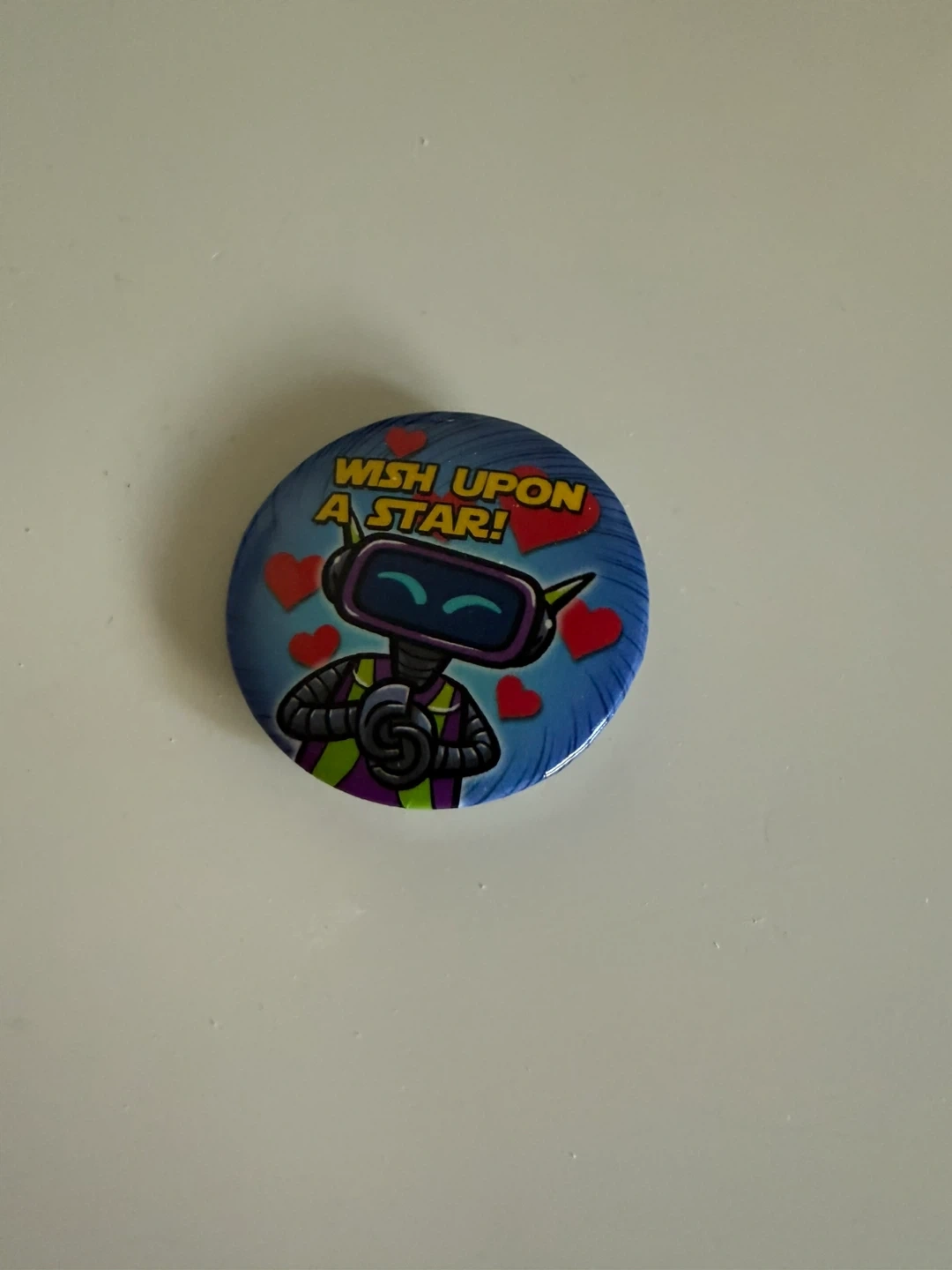 A fun button pin featuring a cute robot character. It has the text "WISH UPON A STAR!" and red hearts. This pin is great for decorating backpacks or jackets!