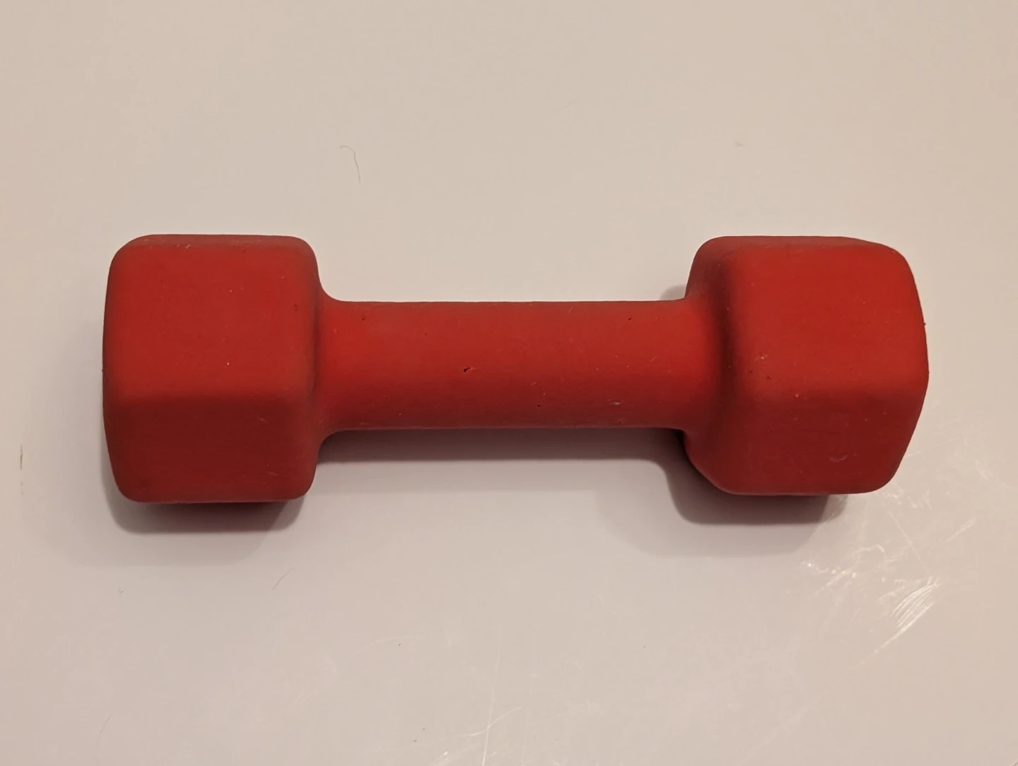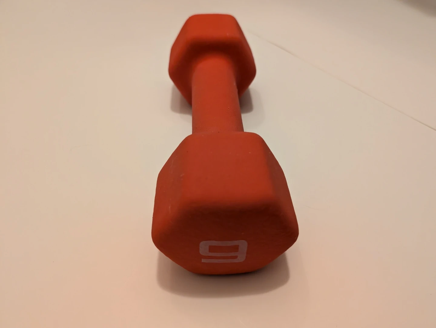 To sell or trade: a single 9 pound red dumbbell with hexagonal heads. It has an iron core (ASTM A48 Grade 20) and is coated with 3mm neoprene to enhance grip and increase comfort. CAP brand.