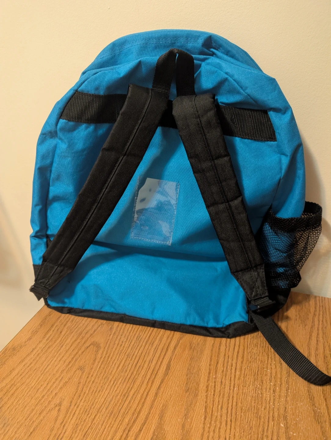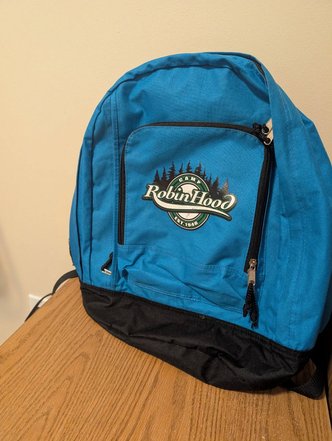 This is a blue backpack with the Camp Robin Hood logo on the front. It features multiple zippered compartments and side mesh pockets. It's great for carrying your essentials for a day out or for camp!