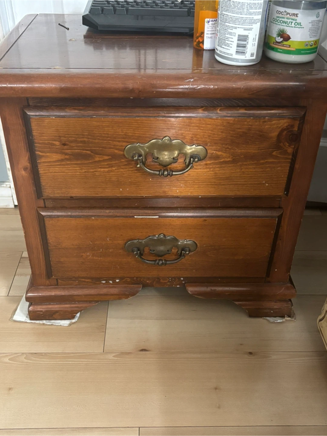 A wooden nightstand with two drawers for storage. It has a classic design that would fit in many bedrooms. Perfect for keeping your essentials bedside! Quality is good.
