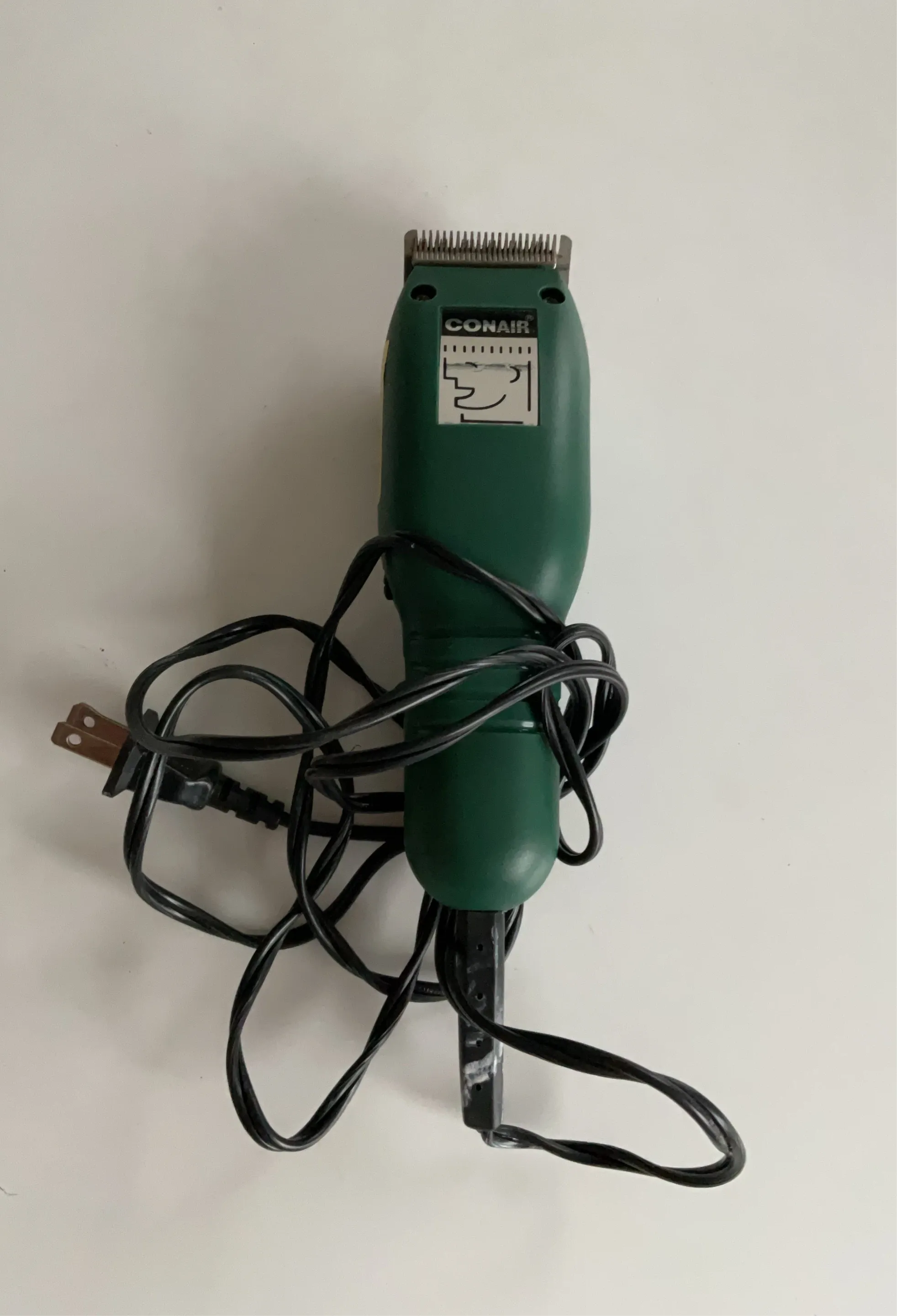 Conair green corded hair clippers for grooming. This unit comes with a power cord and is ready for use. It's designed for efficient hair trimming.