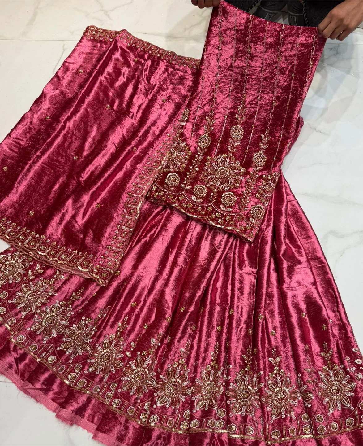Beautiful pink velvet Indian outfit with gold embroidery. The fabric has a lovely sheen and the embroidery adds a touch of elegance. Perfect for a special occasion!