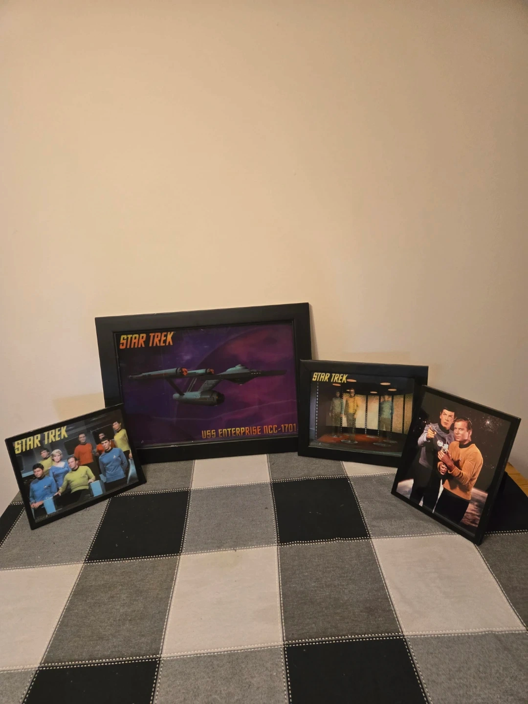 A collection of four framed prints featuring classic Star Trek imagery. Includes the USS Enterprise NCC-1701 and various cast scenes. Perfect for any Star Trek fan's display!