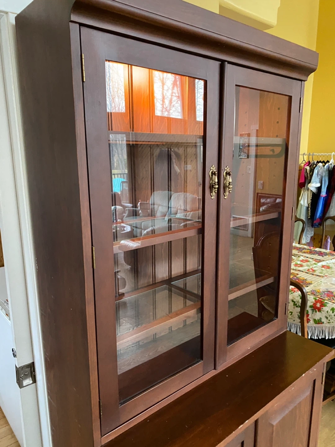 Beautiful solid china cabinet with glass display top and enclosed storage base. Perfect for showcasing dishes, glassware, collectibles, or even using as a bar cabinet.
