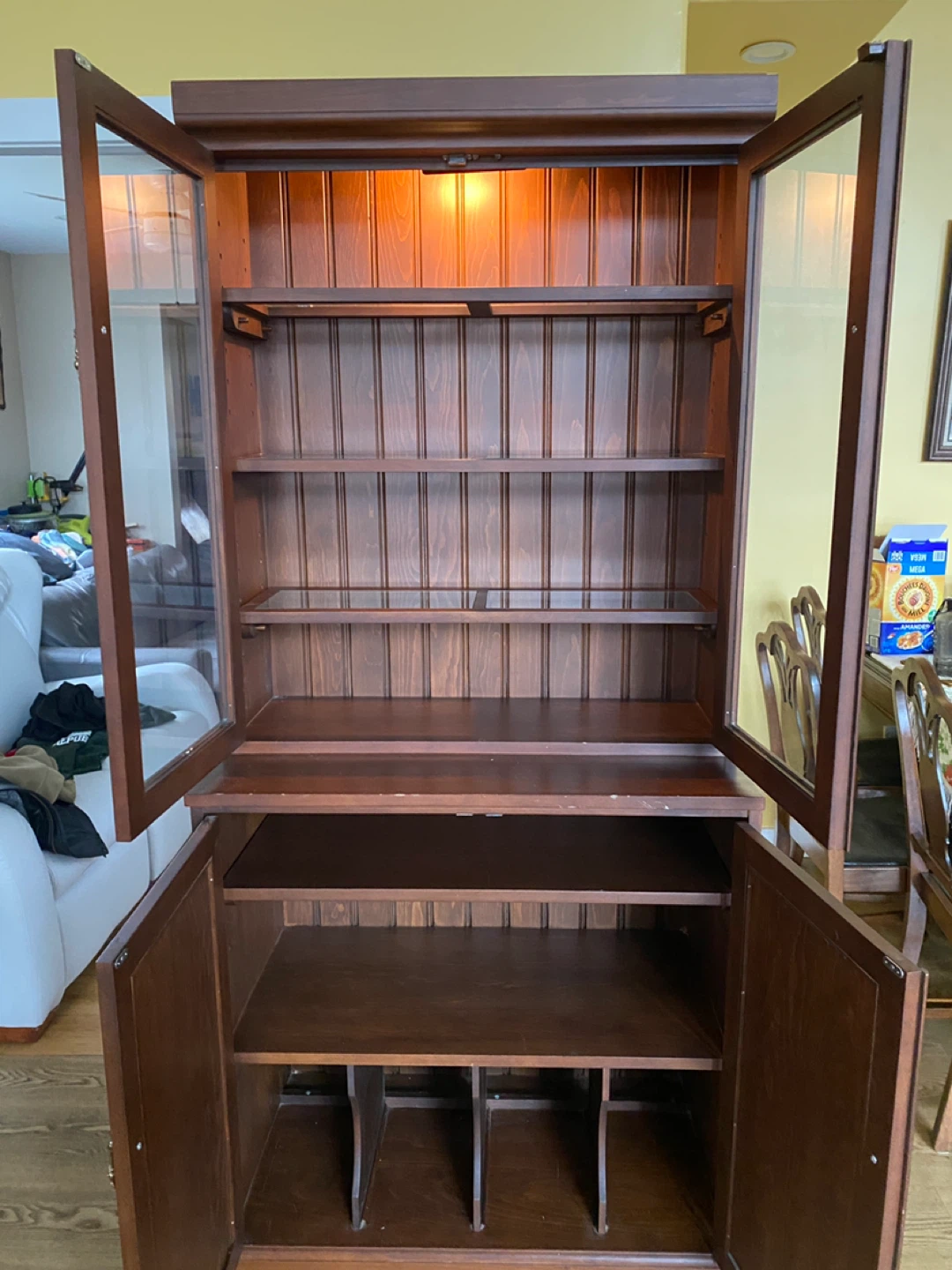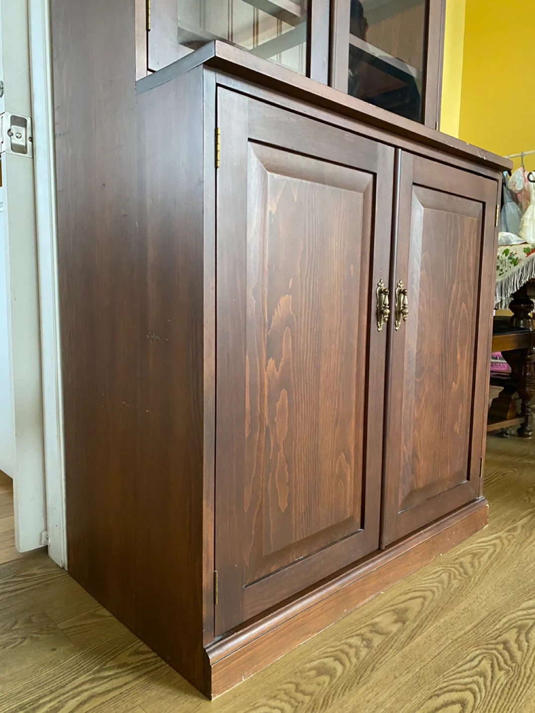 Beautiful solid china cabinet with glass display top and enclosed storage base. Perfect for showcasing dishes, glassware, collectibles, or even using as a bar cabinet.