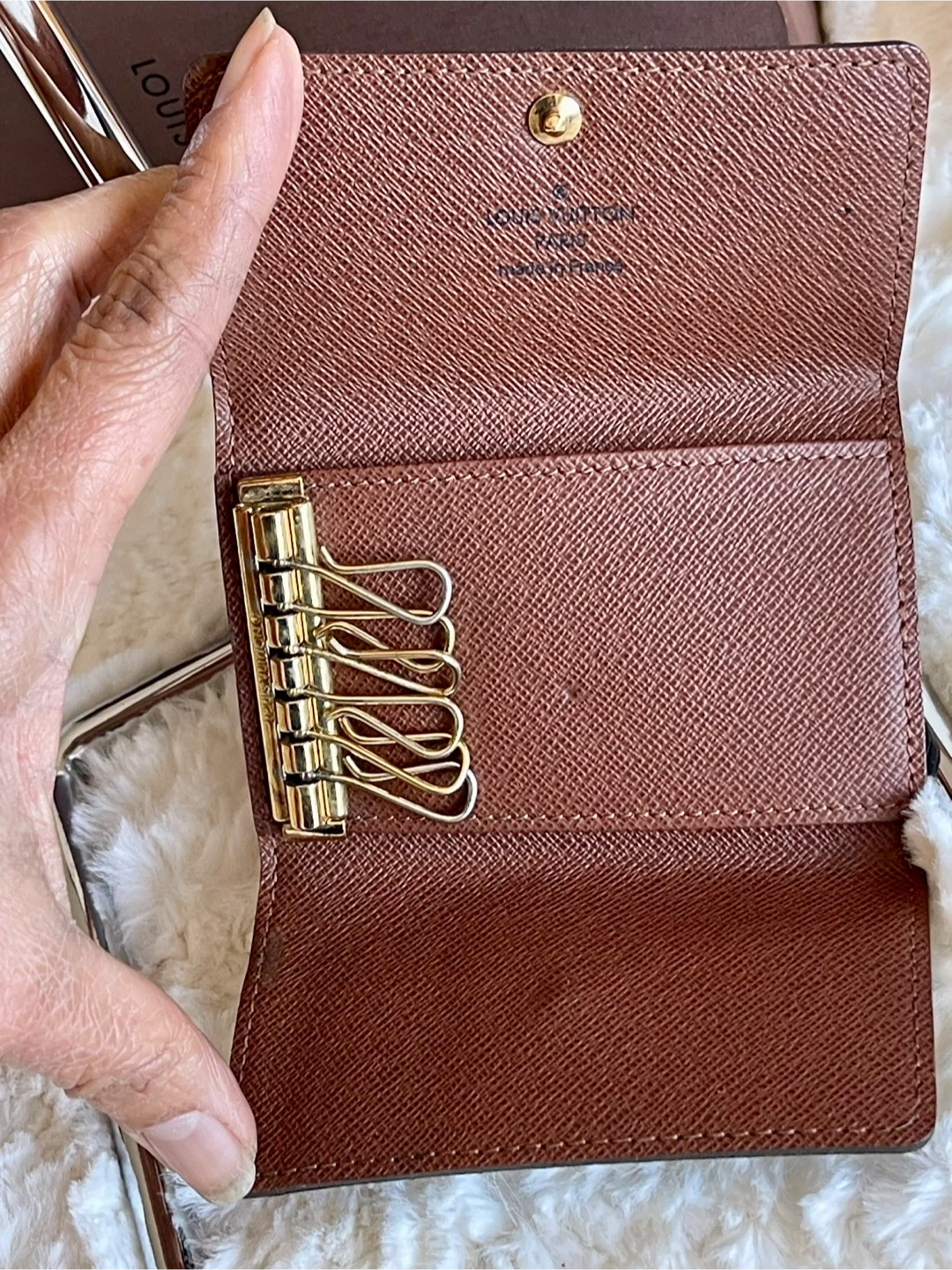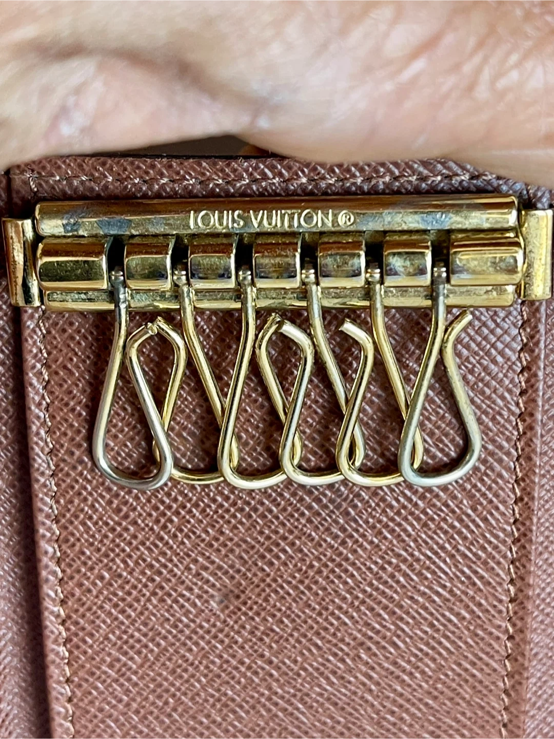This is a Louis Vuitton Monogram 6 Key Holder. It's crafted from coated canvas with gold-tone hardware. This holder includes six key hooks.