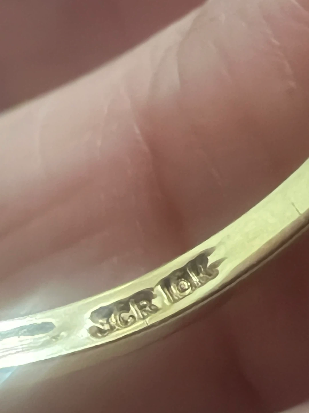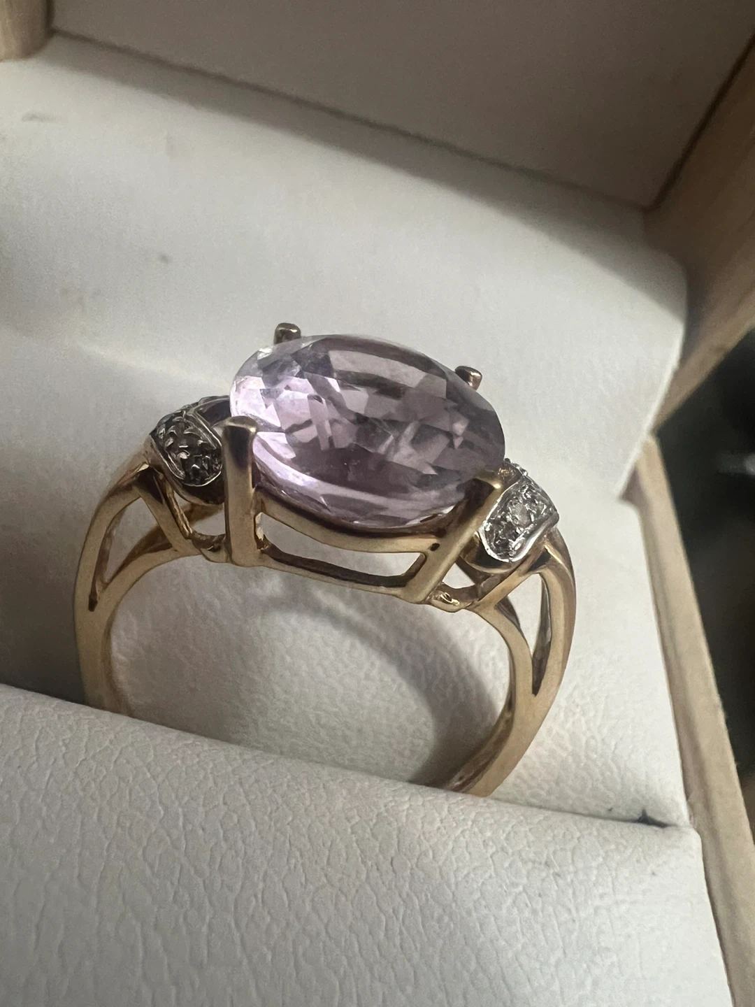 A stunning 10k gold ring featuring an oval kunzite 5 carat centre stone. It's accented with small diamond details on the shoulders. This ring would make a lovely gift for someone special!