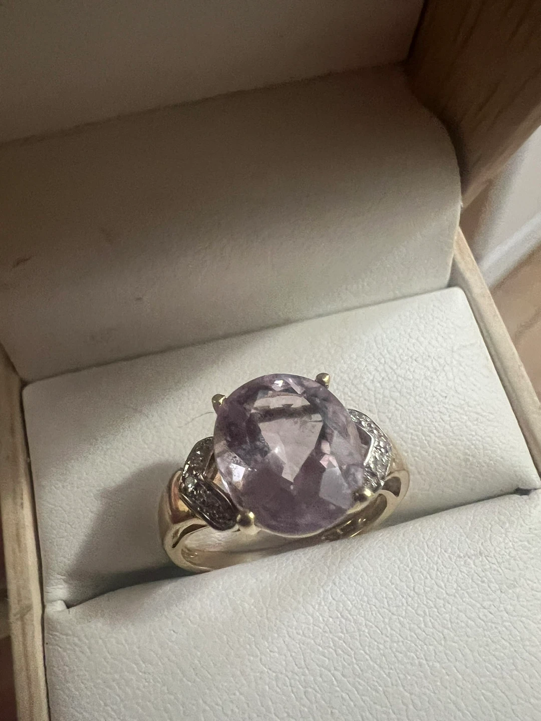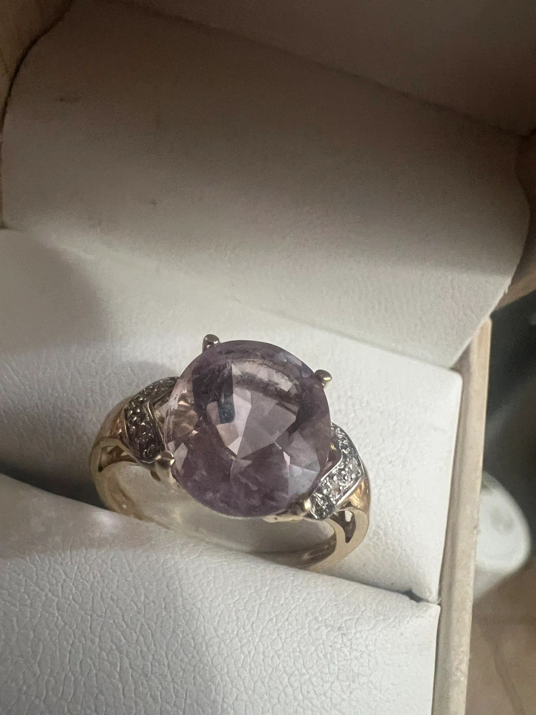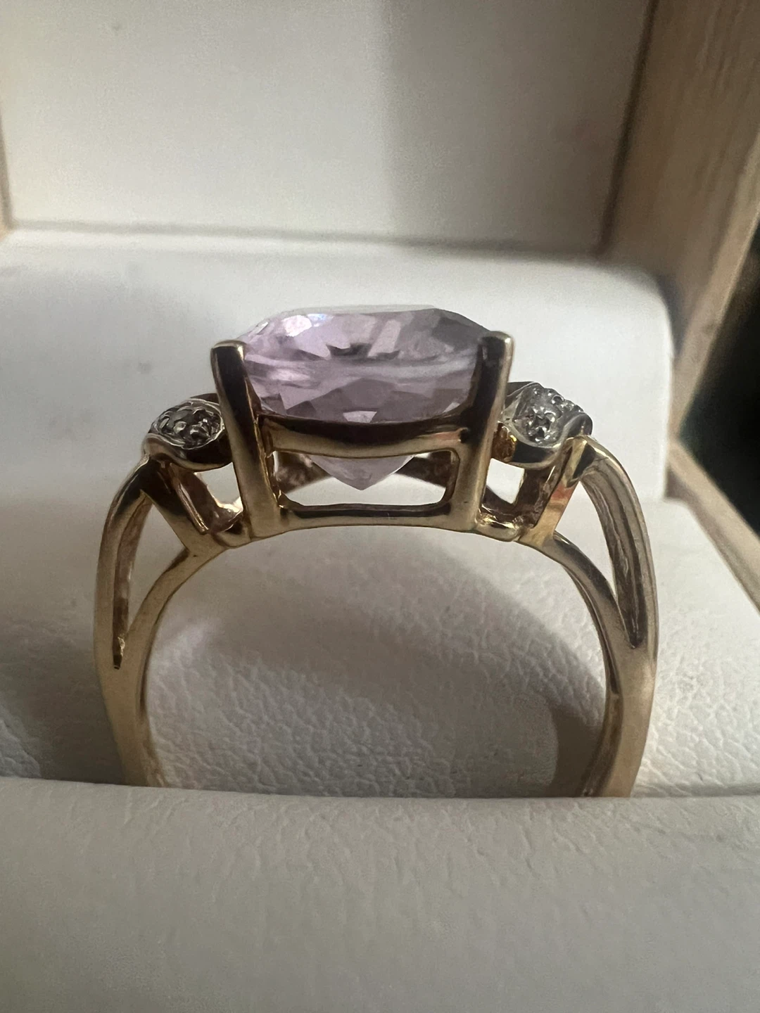 A stunning 10k gold ring featuring an oval kunzite 5 carat centre stone. It's accented with small diamond details on the shoulders. This ring would make a lovely gift for someone special!